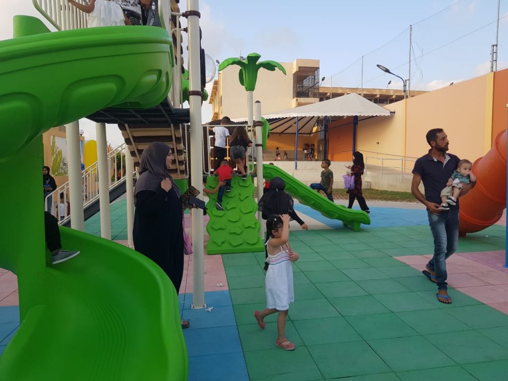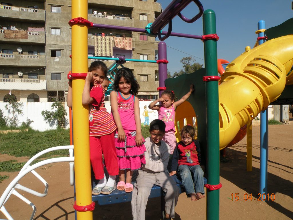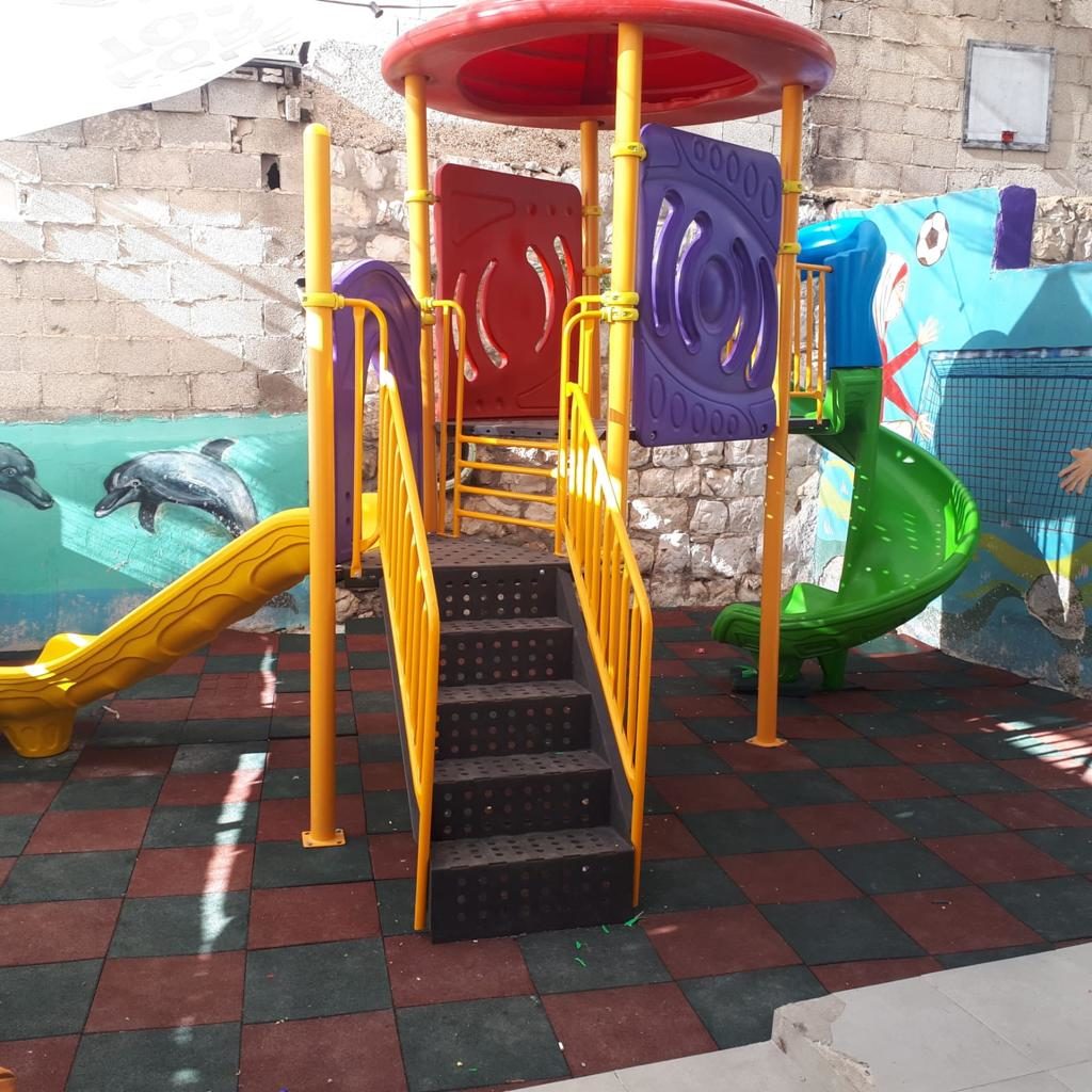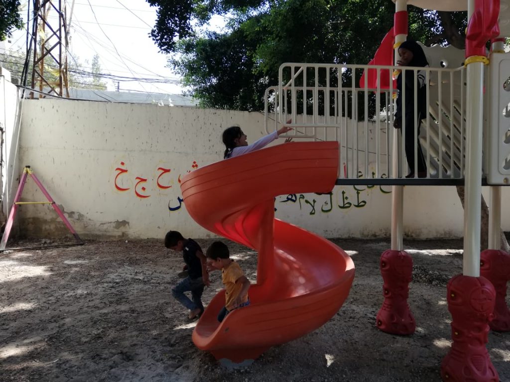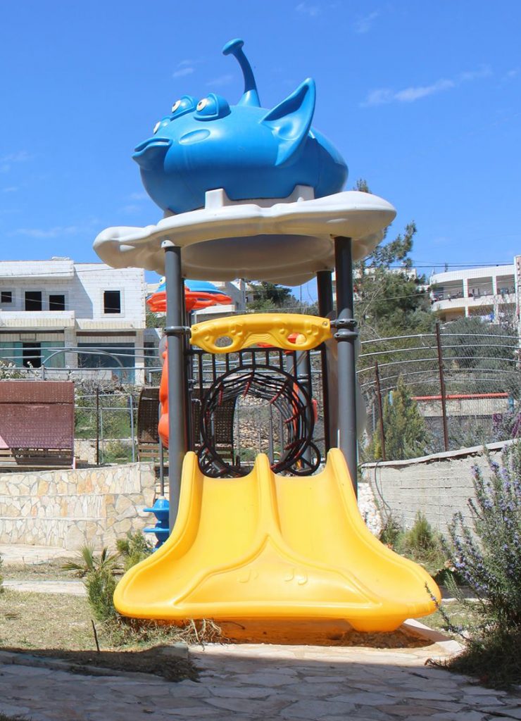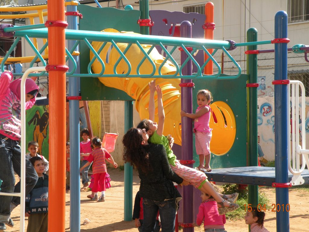 This playground was built in partnership with UNRWA at the Baraaem Kindergarten in the Mia Mieh refugee camp is located south of the city of Saida. The camp was established in 1954 and extends over an area of 54,000 sq m.  The camp survived a series of major events in 1982, when the Israeli invasion destroyed many of the camp’s shelters. These shelters were not rebuilt and alternative shelters were built instead along the southern border of the camp.