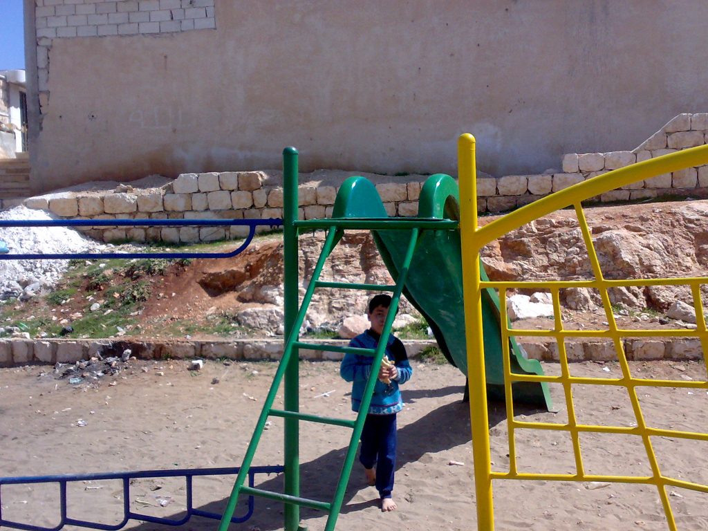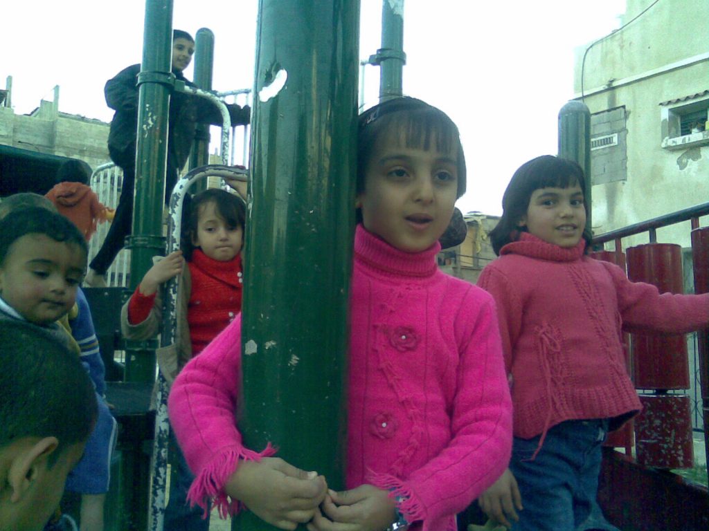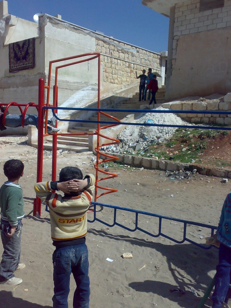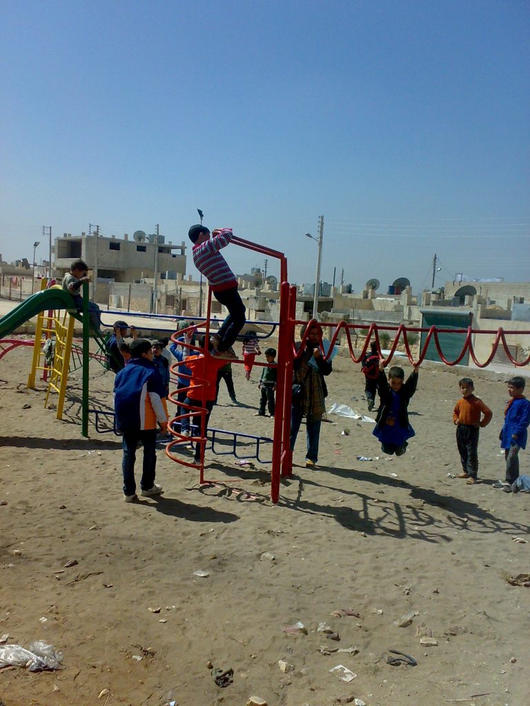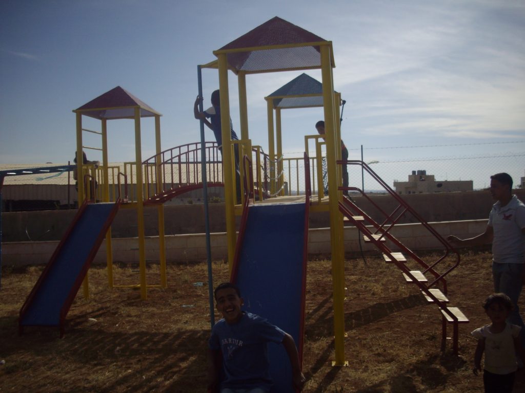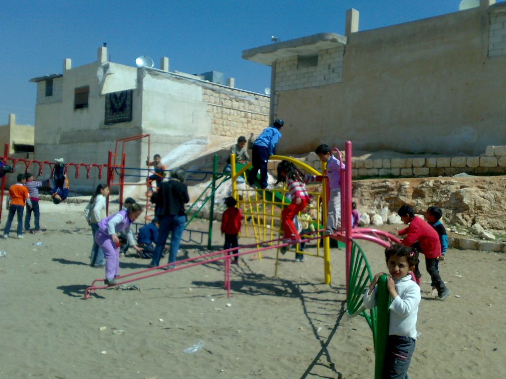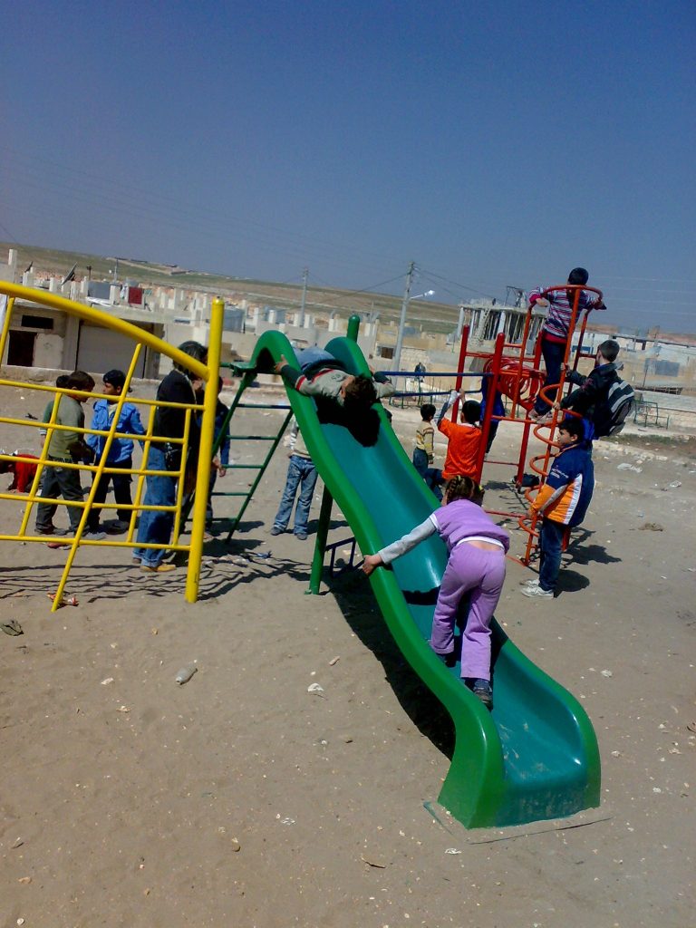 This was our first and only playground built in Syria, shortly before the outbreak of the civil war.  It is located in the UNRWA refugee camp of Ein el Tal. The refugee camp is the largest official Palestinian refugee camp in Syria. Established between 1948 and 1950, approximately 19,000 Palestinians live in and around the camp. Built from army barracks constructed by Allied Forces during WWII, the shelters of the camp are some of the most unhealthy and unsafe of Syria’s camps.