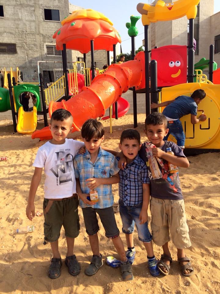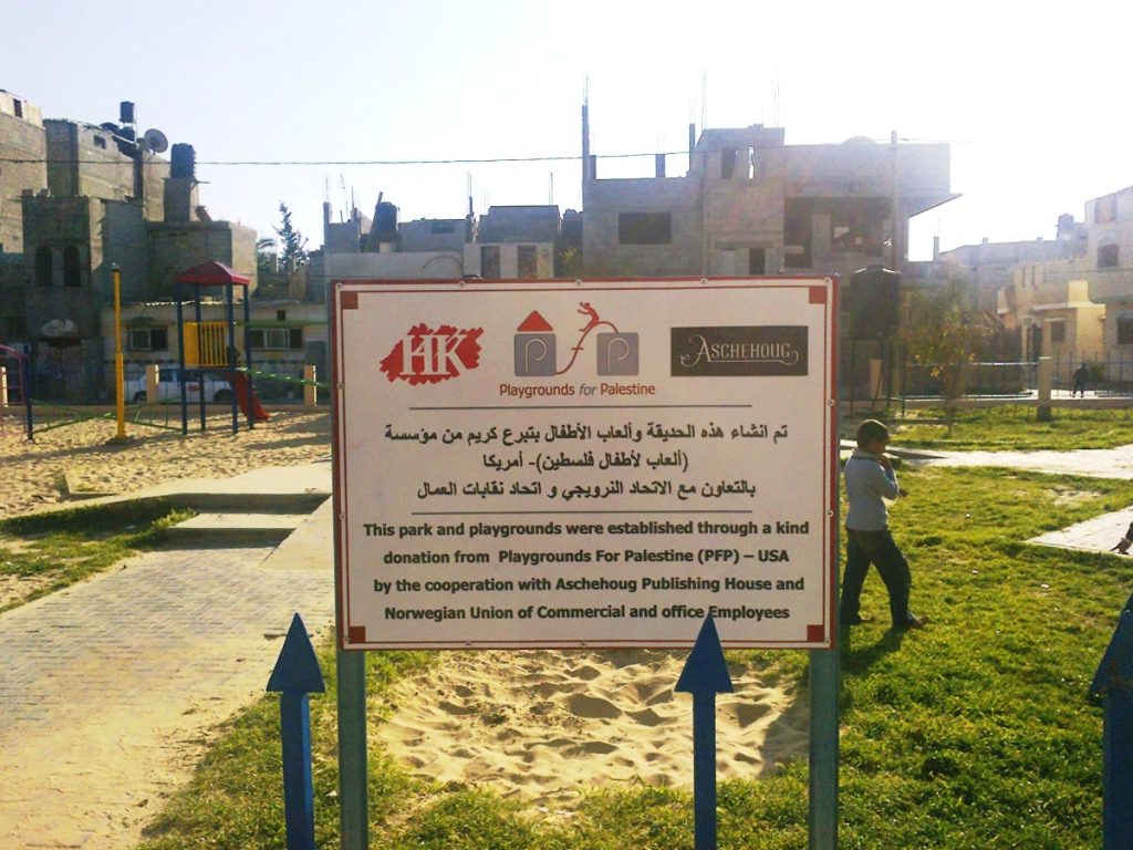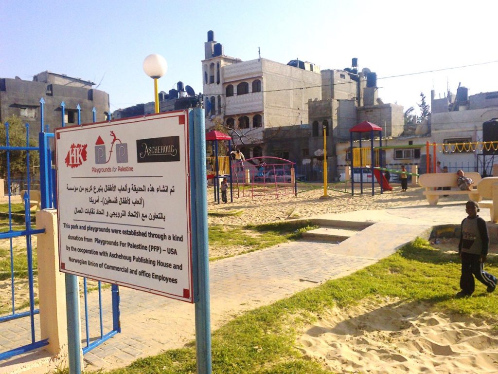 This is our fourth playground in Gaza, which is made possible by a generous donation, which was collected by Aschehoug Publishing House, the Trade Union and Administration of Aschehoug Publishing House, and the Norwegian Union of Commercial and Office Employees.