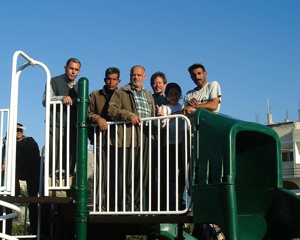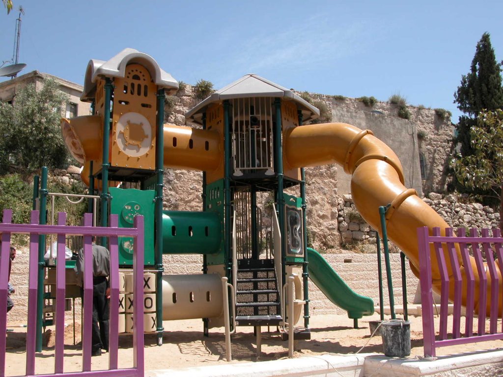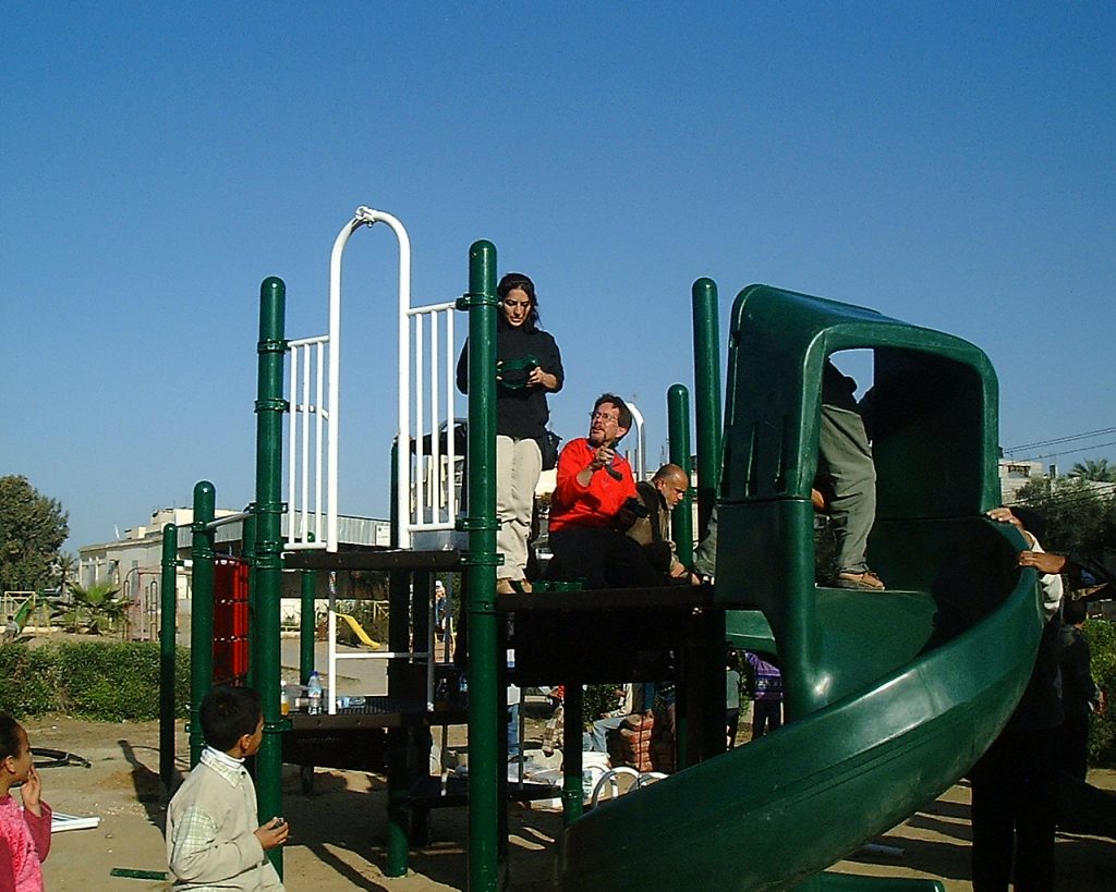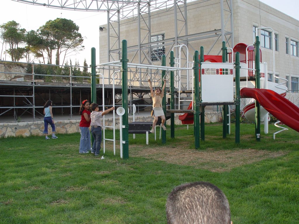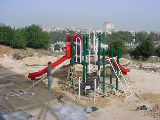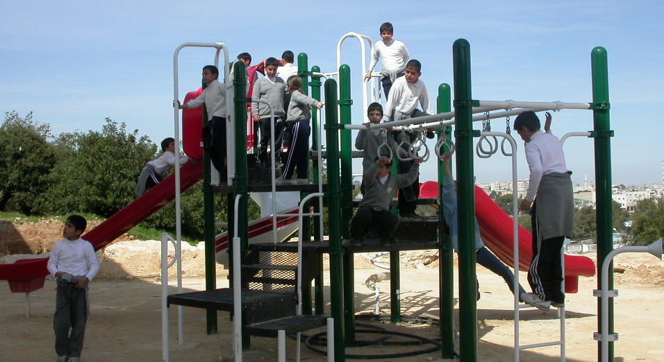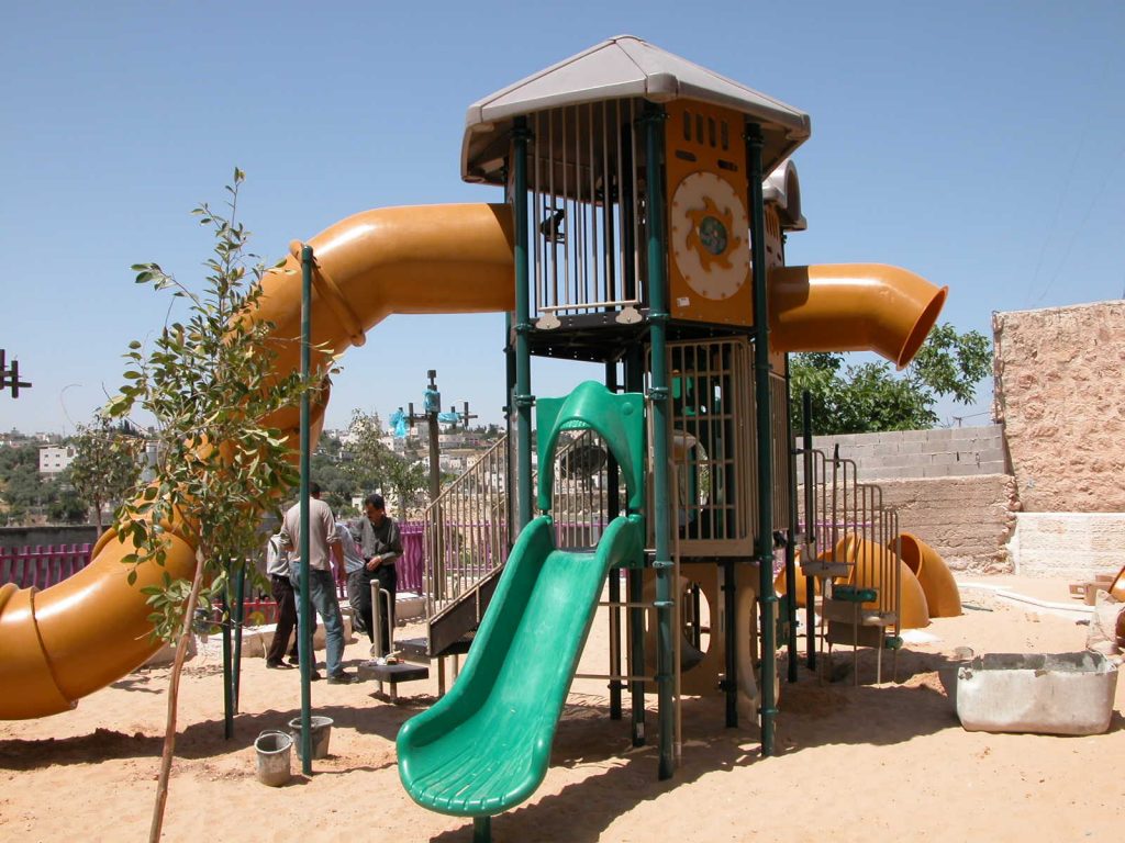Playgrounds for Palestine’s first playground was acquired from the American Playground Corporation and was shipped to Bethlehem after nearly one full year of preparations. It finally arrived in Bethlehem in November 2002, thanks to the efforts of ANERA (American Near East Refugee Aid). Once there, however, it could not be erected in time for Christmas as planned due to Israeli closures and curfews. Despite this, two affiliates of Playgrounds for Palestine, Susan Abulhawa and Mark Miller, traveled to Bethlehem to oversee its installation, which was finally completed mid-January.  A group of dedicated local contractors and laborers worked day and night to get as much done during the few hours they were free from a forbidding curfew. Finally, two weeks later, PfP’s first playground was erected.