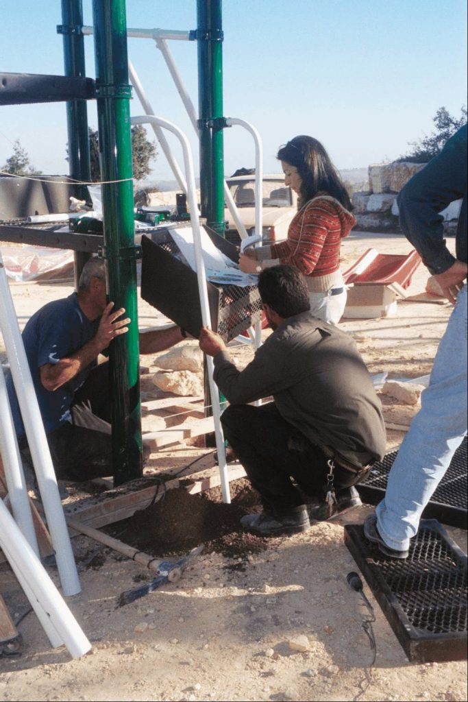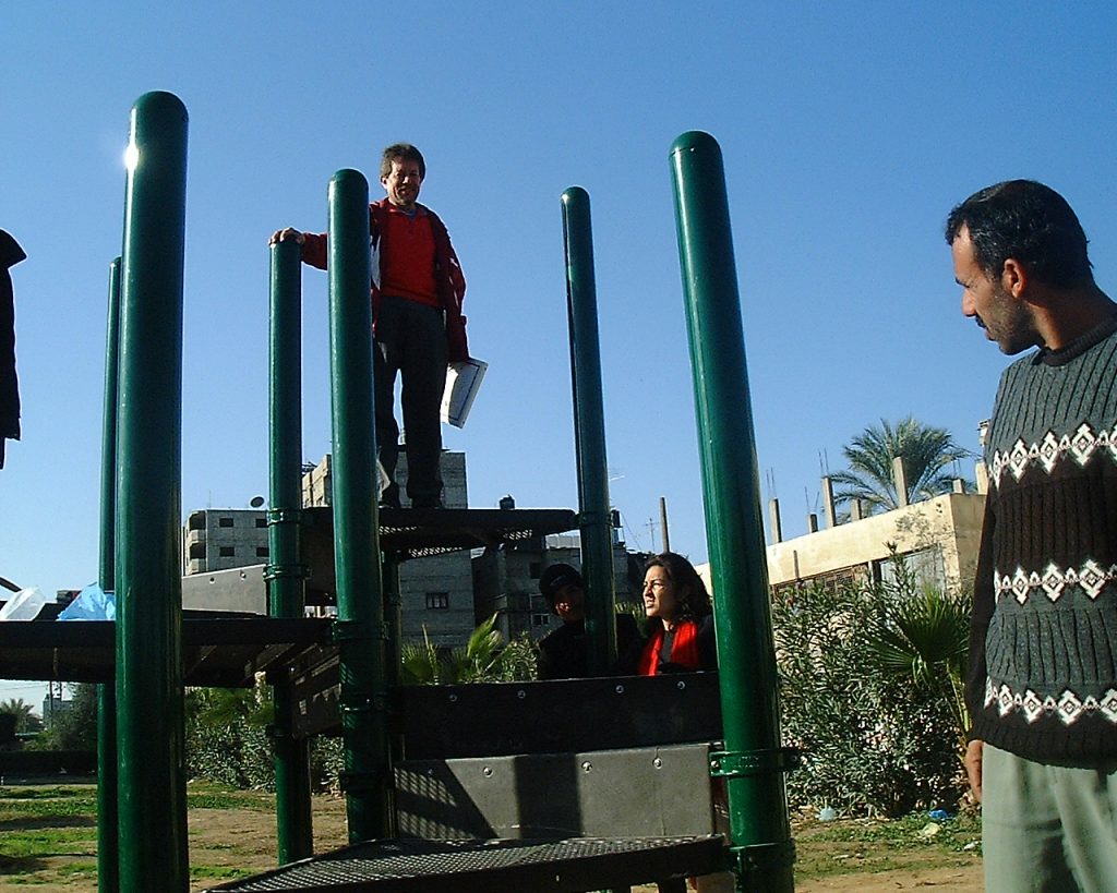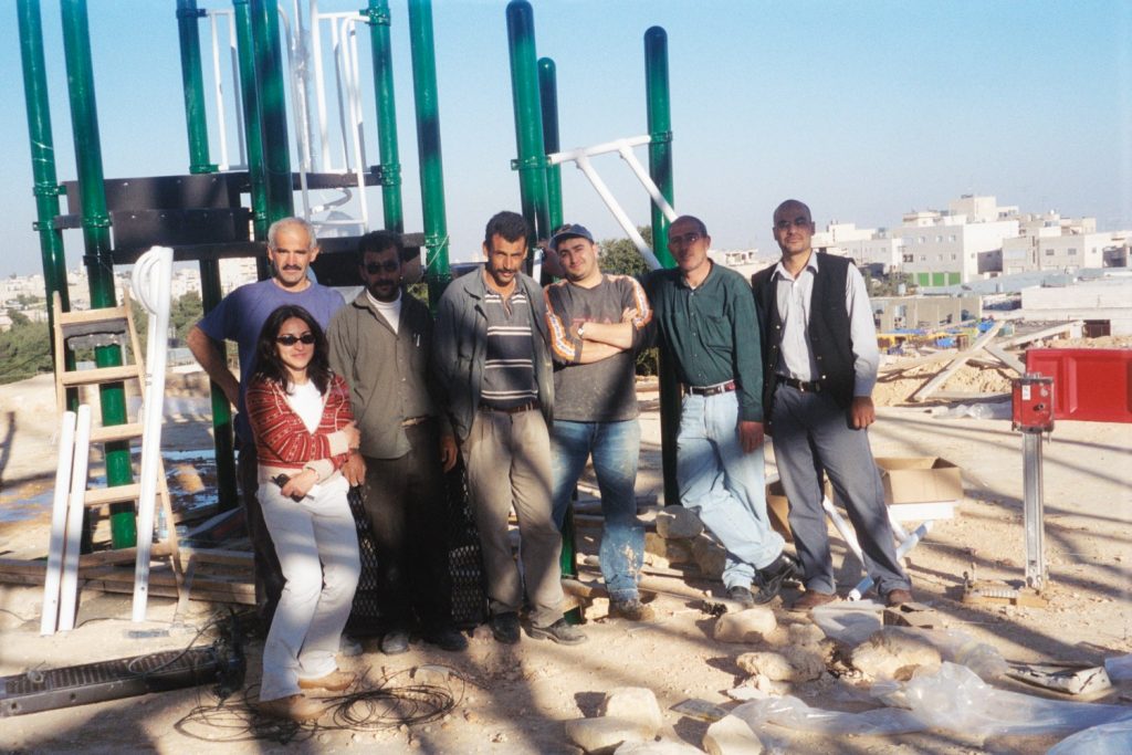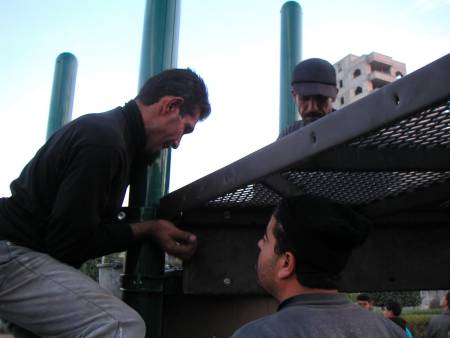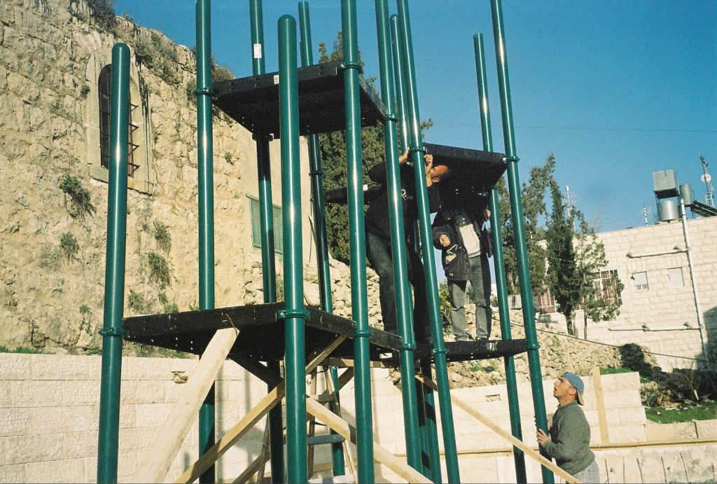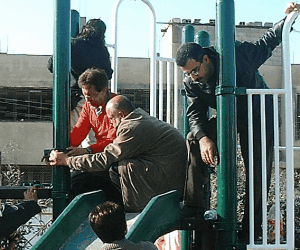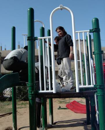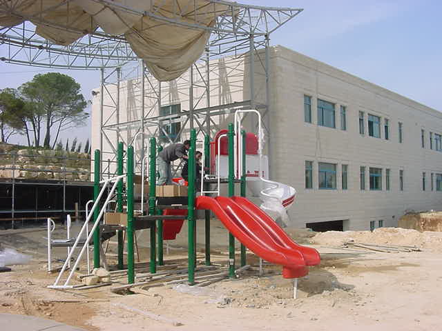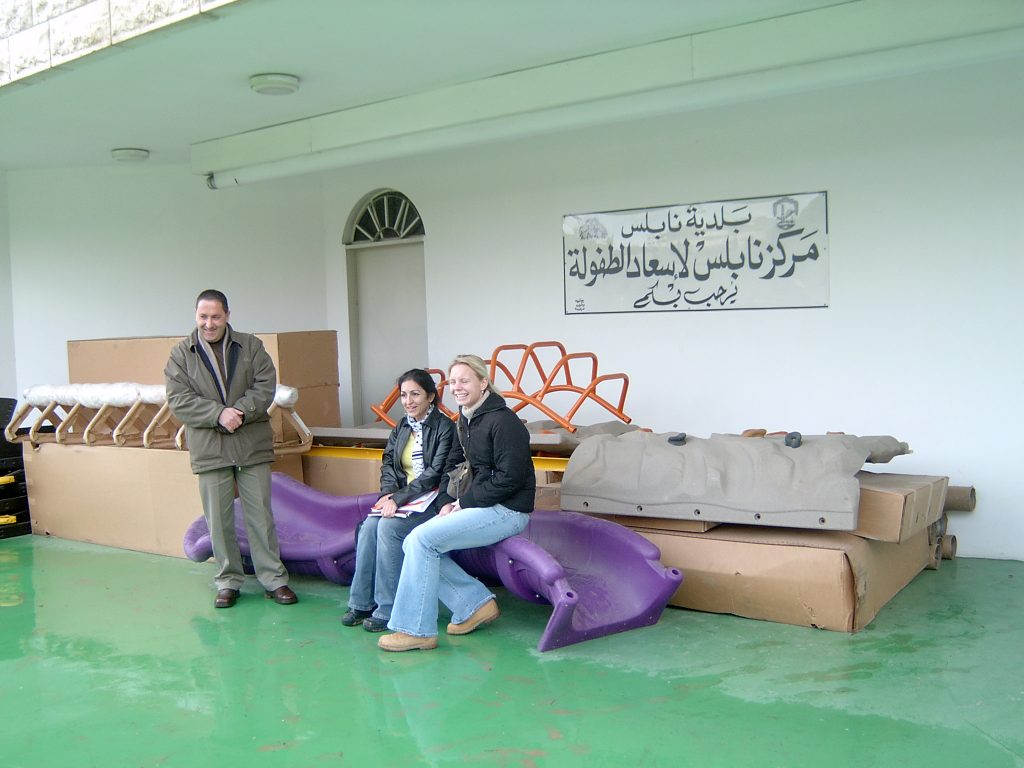 Playgrounds for Palestine’s first playground was acquired from the American Playground Corporation and was shipped to Bethlehem after nearly one full year of preparations. It finally arrived in Bethlehem in November 2002, thanks to the efforts of ANERA (American Near East Refugee Aid). Once there, however, it could not be erected in time for Christmas as planned due to Israeli closures and curfews. Despite this, two affiliates of Playgrounds for Palestine, Susan Abulhawa and Mark Miller, traveled to Bethlehem to oversee its installation, which was finally completed mid-January.  A group of dedicated local contractors and laborers worked day and night to get as much done during the few hours they were free from a forbidding curfew. Finally, two weeks later, PfP’s first playground was erected.