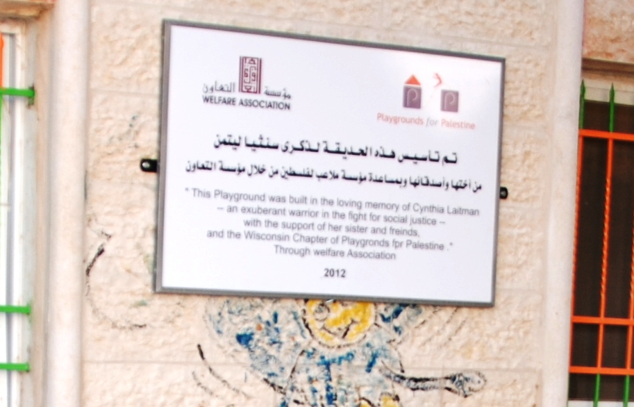 This playground was built in memory of Cynthia Laitman, with love from her sister, Judith, her friends, and the Madison, WI chapter of Playgrounds for Palestine.