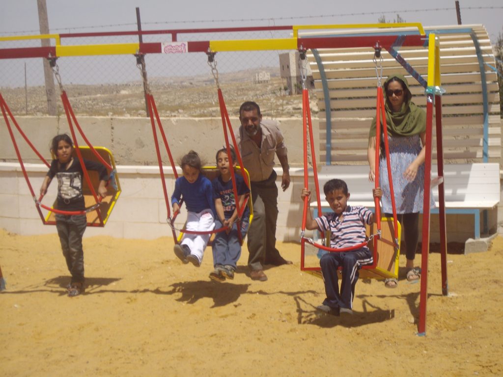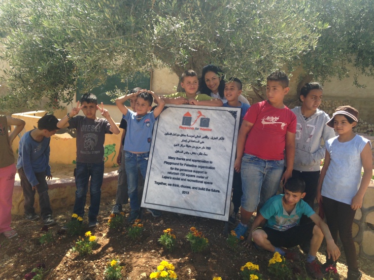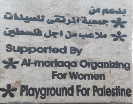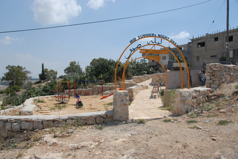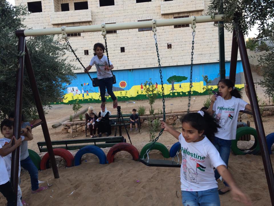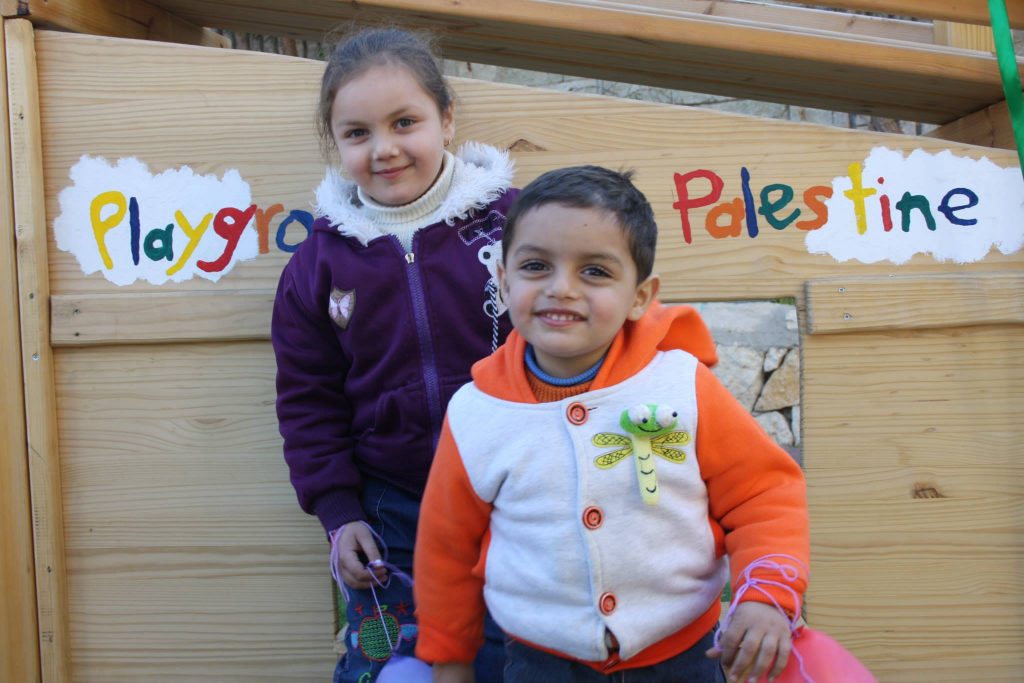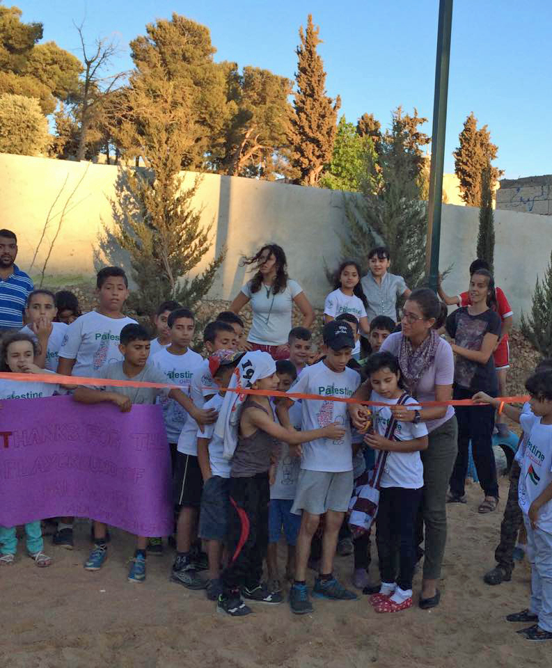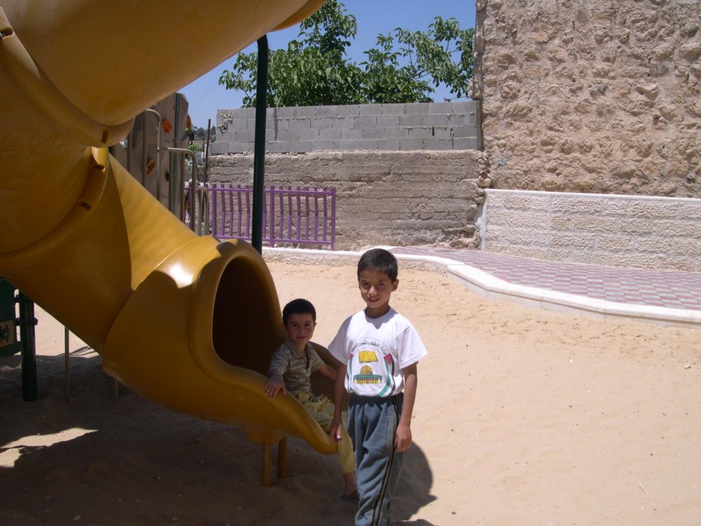 This playground was built in celebration of the marriage of Heather and Armen Vartian. In lieu of wedding gifts, the couple asked their guests to make a donation toward this playground in the refugee camp where Heather had previously lived and worked.  Heather and Armen said: “We passionately care about the people of Palestine, having lived and worked there ourselves. We traveled to the West Bank together in 2003, and we want to use this opportunity to give something.”