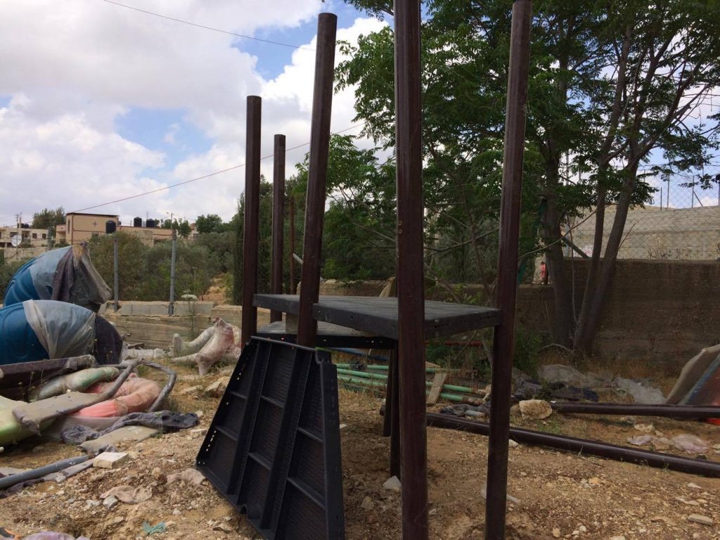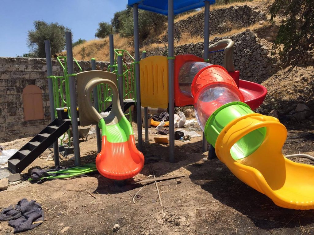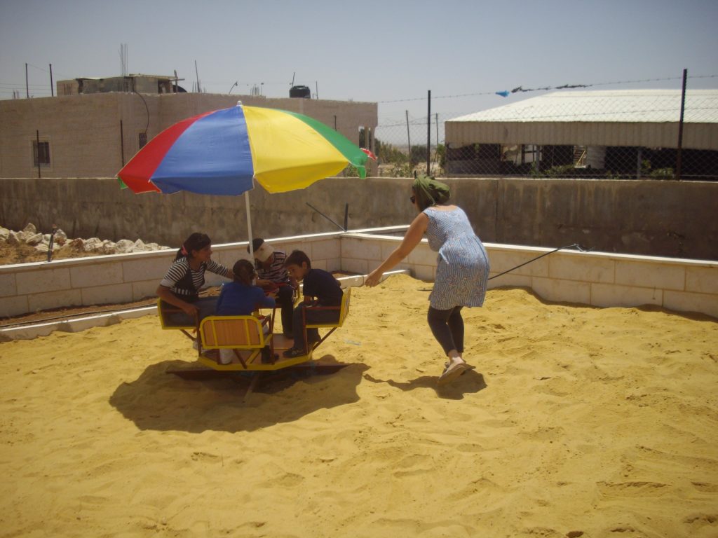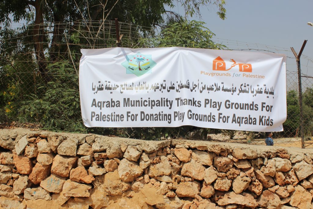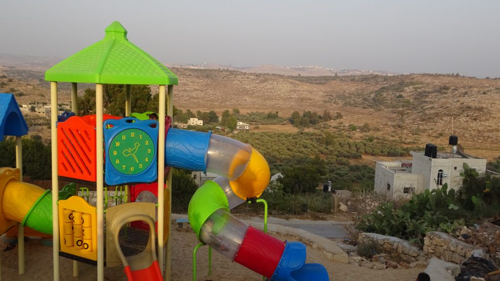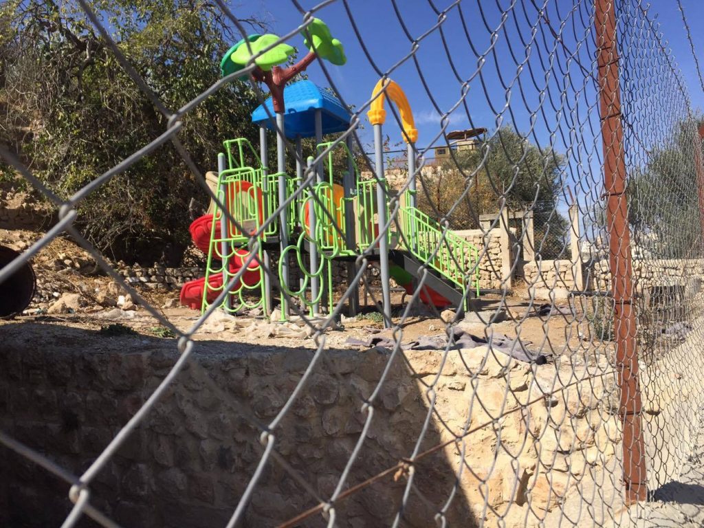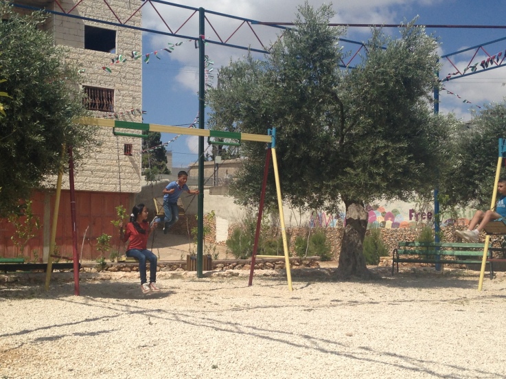 Located in the Jordan Valley, Al Aqaba is an ancient Palestinian village, dating at least to the 6th century.  Designated “Area C,” it has been under complete control of the Israeli military and faces frequent demotion and confiscation orders.  Nearly every building in the village, including the mosque, women’s center, and kindergarten has faced demolition orders.  Villagers, however, continue to inhabit their ancestral lands.  This playground was built for the children of Al Aqaba.  To learn more about the this village, go here.
