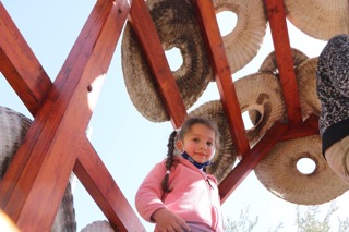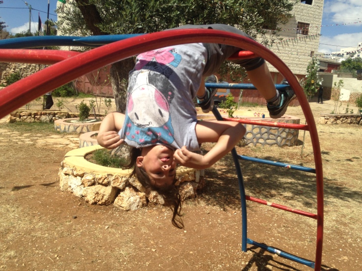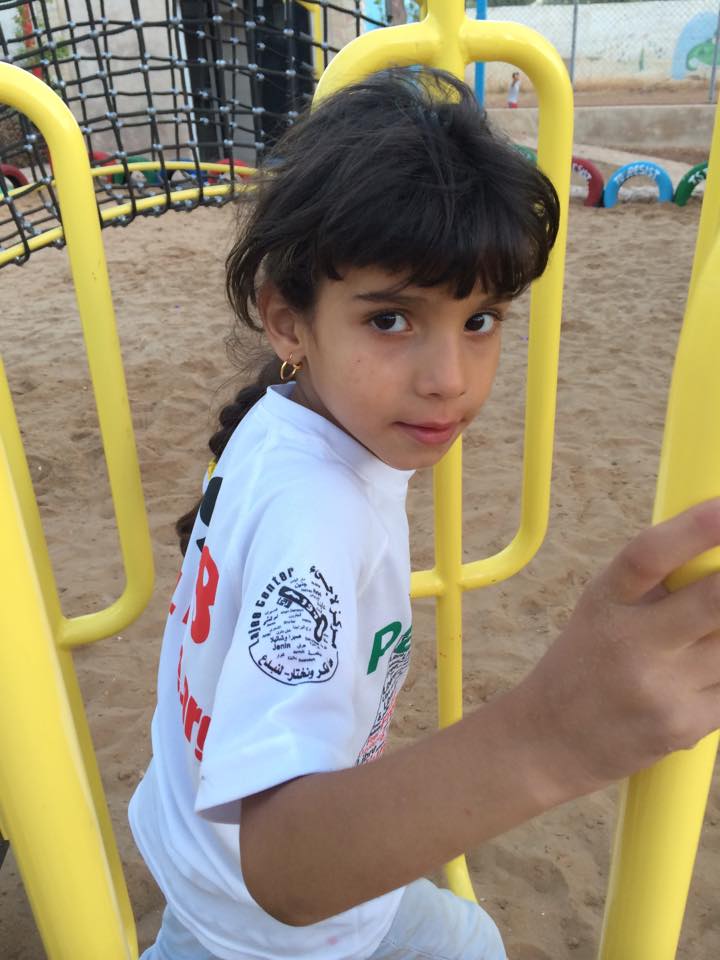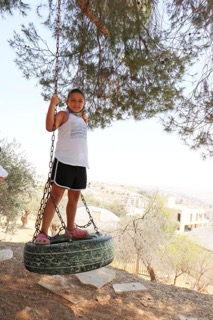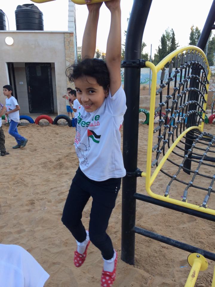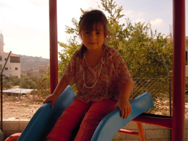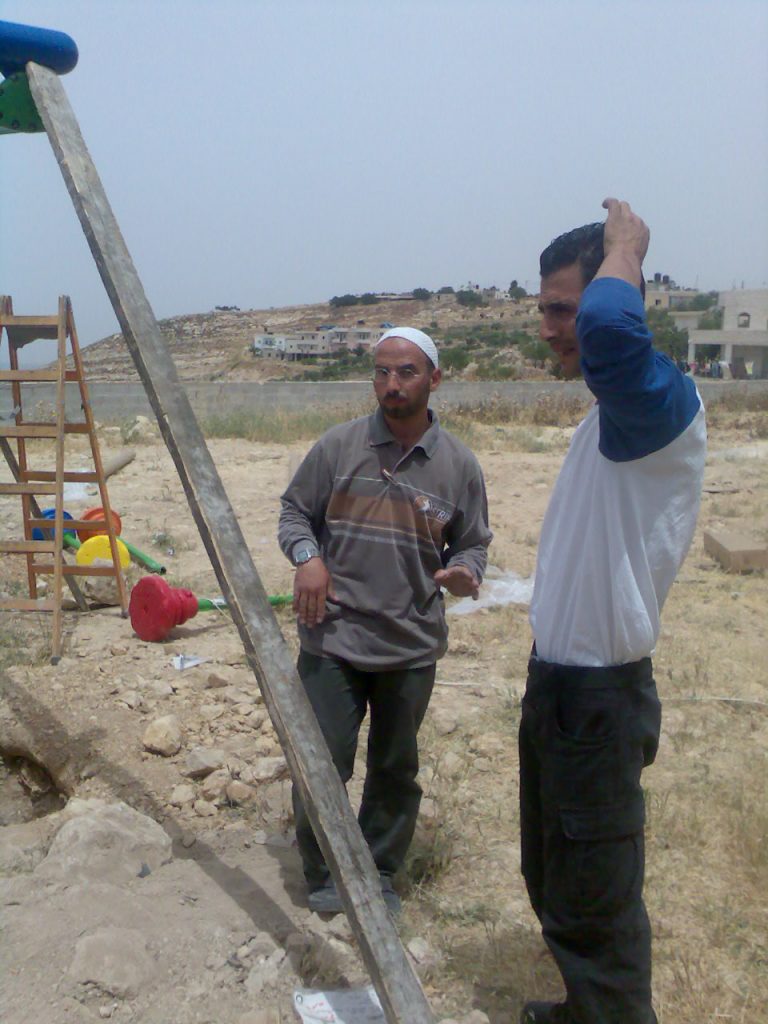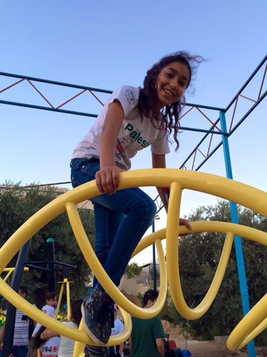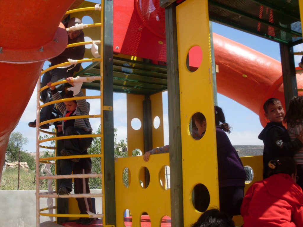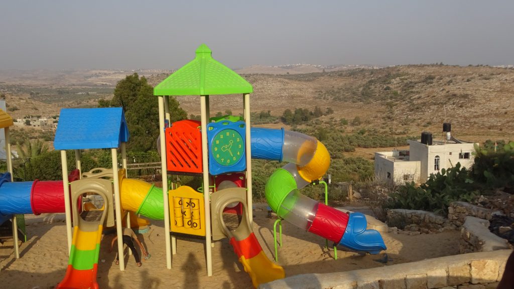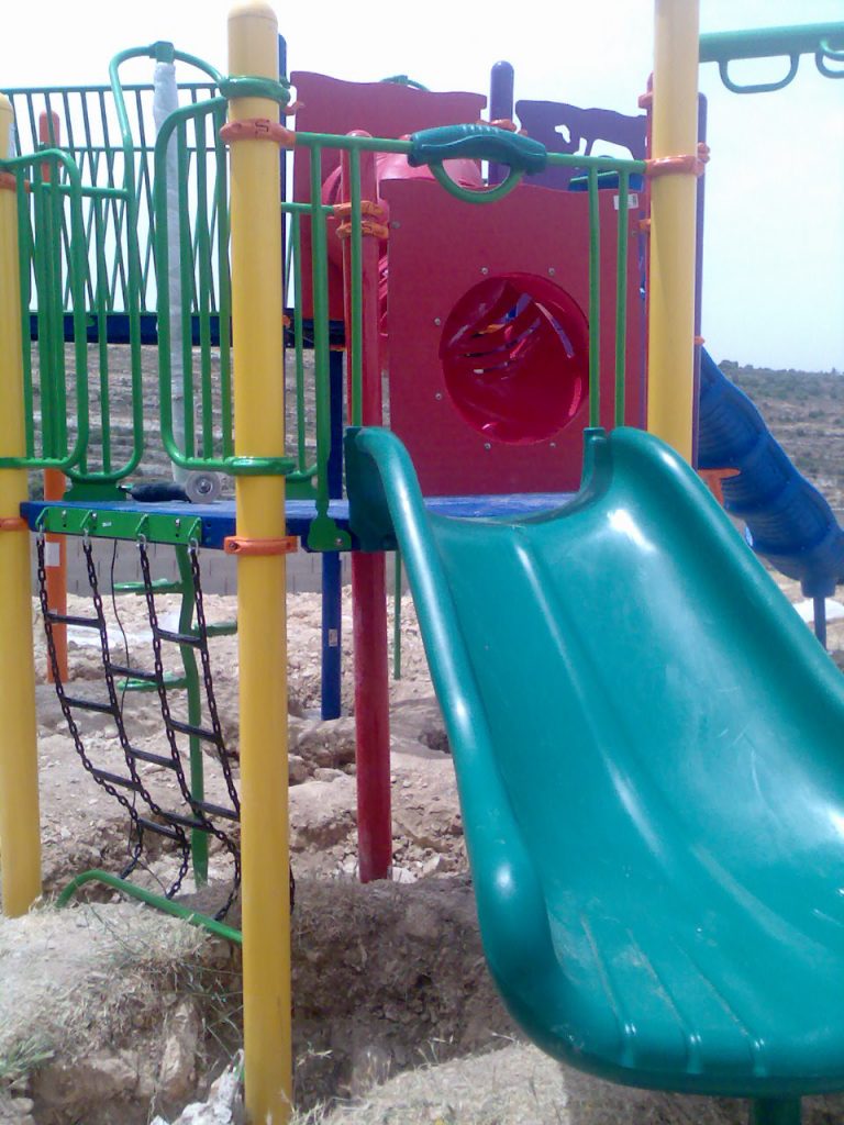 This was the first of two playgrounds built for Abir’s Garden in Al Samoa-Simya, a village on the southern-most edge of the West Bank, south of Hebron.  The daughter of Bassam and Salwa Aramin, Abir was a 10 year old little girl who was shot and killed by an Israeli sniper.  This playground was built in her honor.