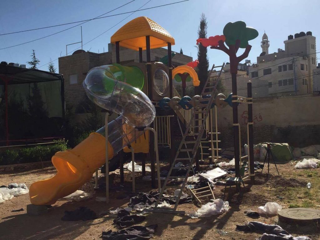 During the construction of this playground, materials had to be transported through a cemetery because Israeli officials denied the use of Al Shuhada Street. After the opening day party, settlers came in the middle of the night to remove all Palestinian flags. Despite these attacks, our children were able to have fun, laugh, and play.