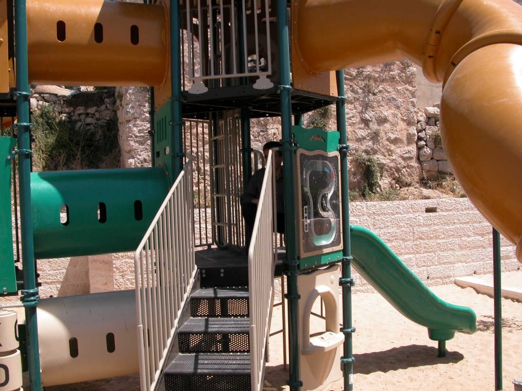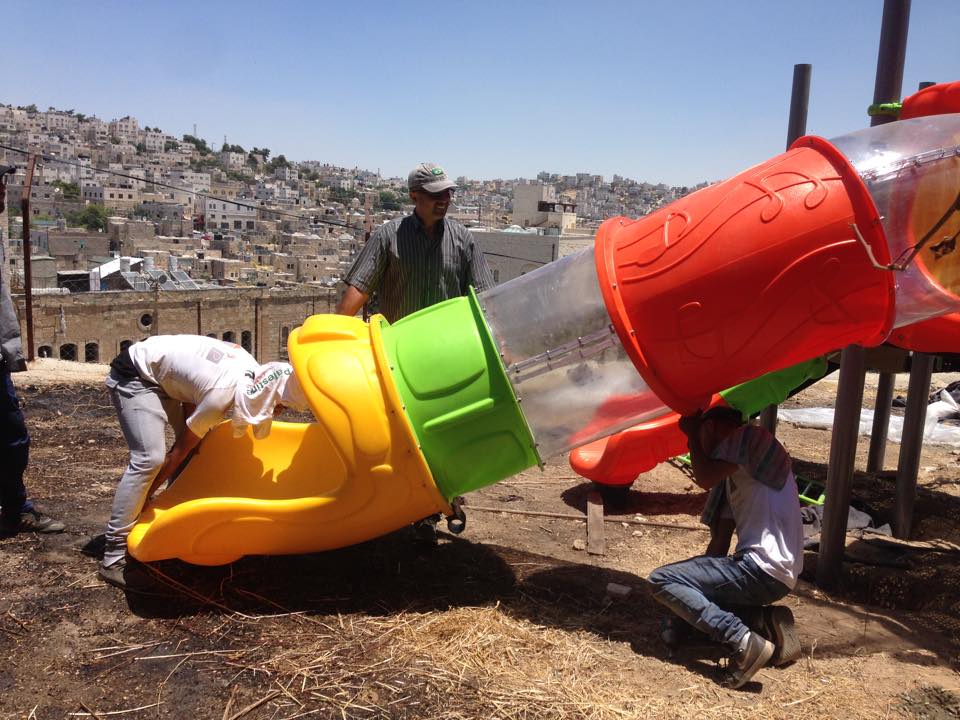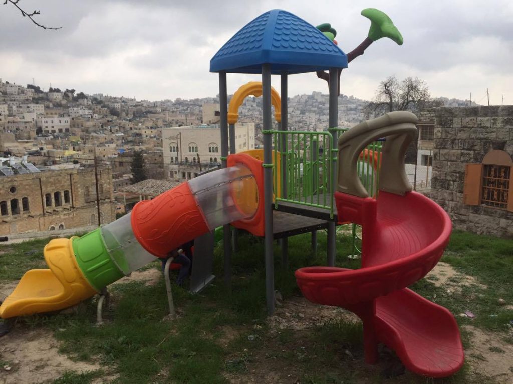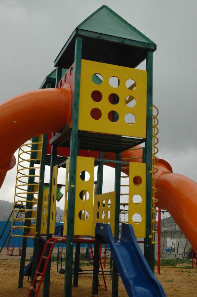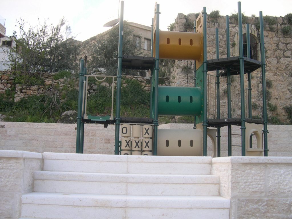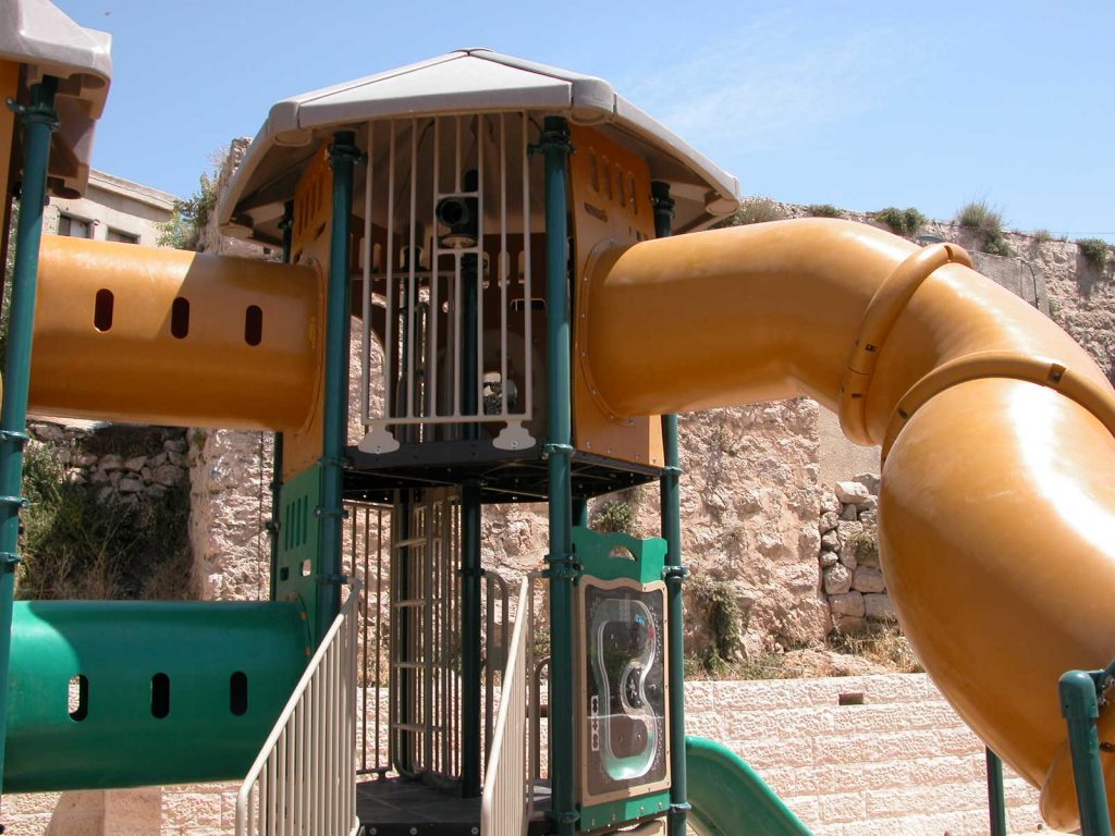 This playground is three-stories high, with numerous activity panels, and structures for climbing, crawling, sliding and imaginative play for a wide range of ages. It is located less than half a mile from the historic Ibrahimi Mosque in the Old City of El Khalil (Hebron). Because children in this area are particularly exposed to settler and occupation violence, the playground here is built strategically between buildings so that the children are better protected when playing.