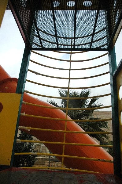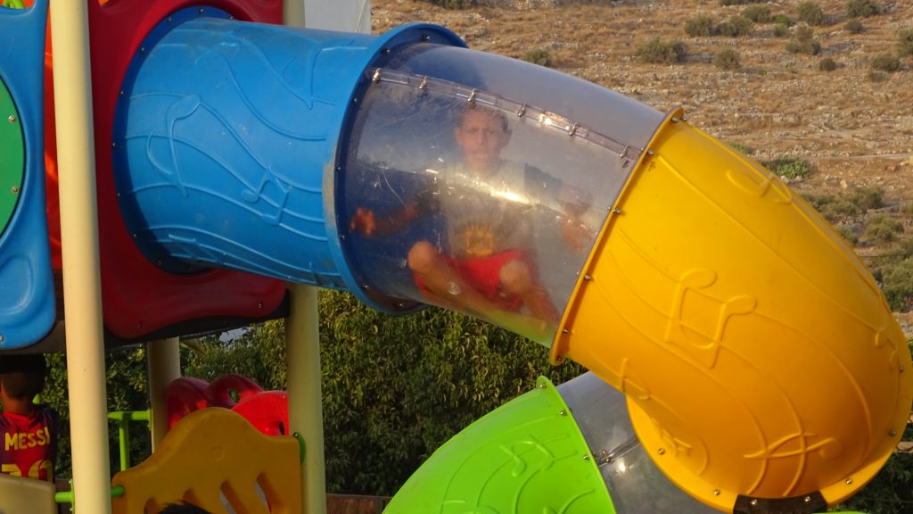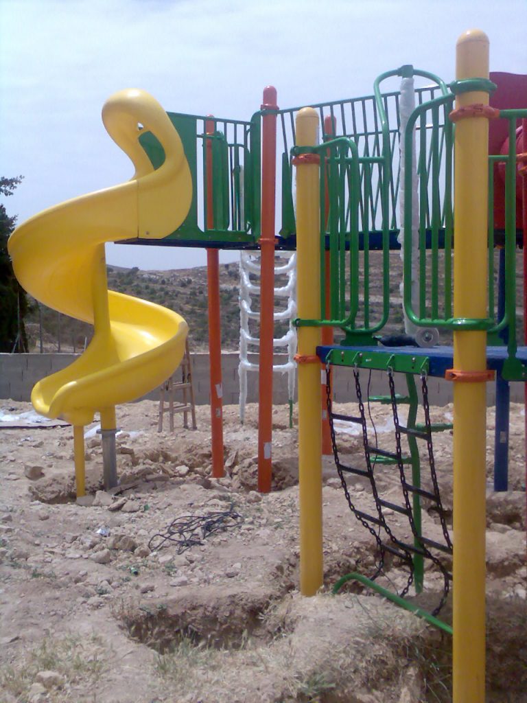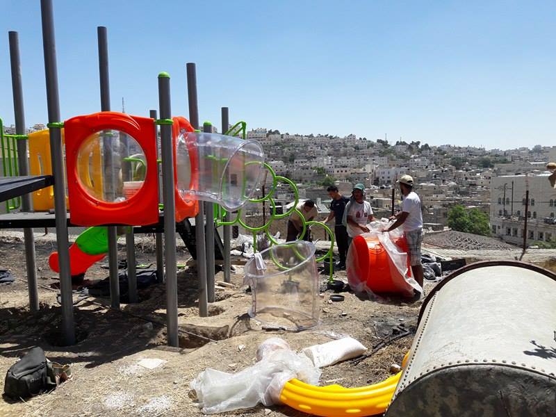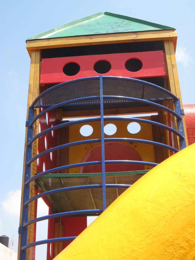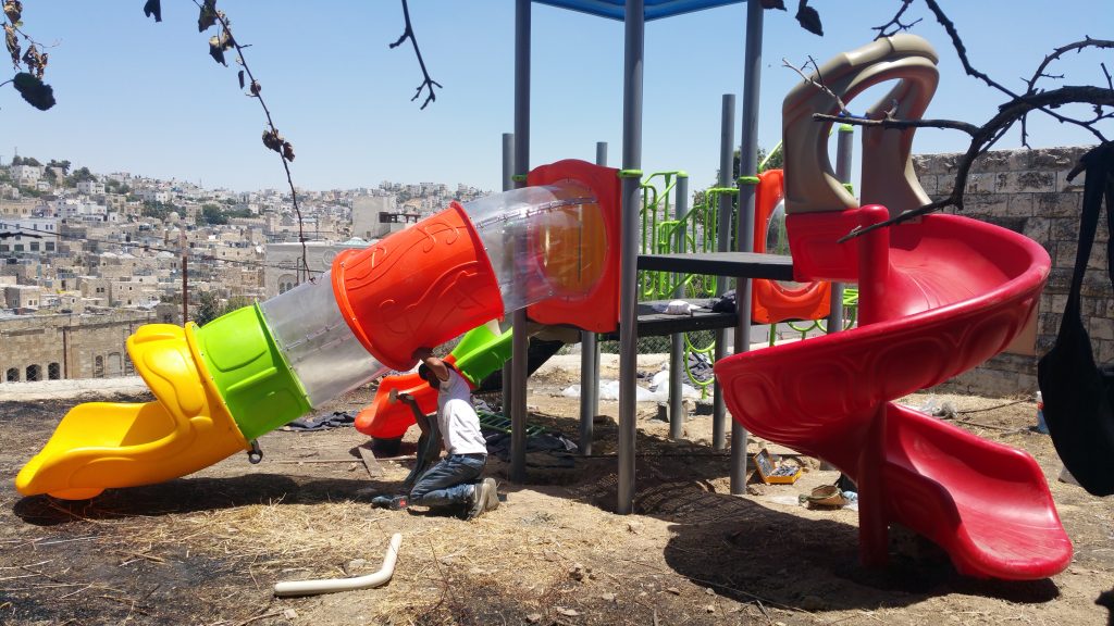This playground is three-stories high, with numerous activity panels, and structures for climbing, crawling, sliding and imaginative play for a wide range of ages. It is located less than half a mile from the historic Ibrahimi Mosque in the Old City of El Khalil (Hebron). Because children in this area are particularly exposed to settler and occupation violence, the playground here is built strategically between buildings so that the children are better protected when playing.