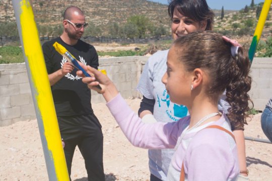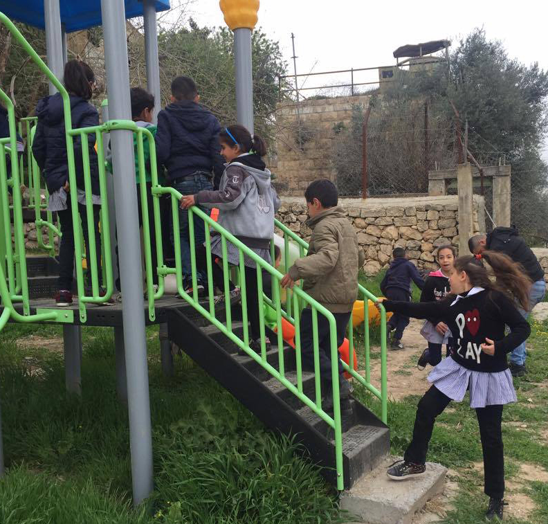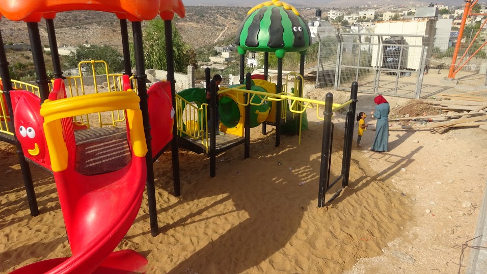 This playground is built on the property of an elementary school in one of the most threatened Palestinian cities.  Qortuba is part of the Hebron District, where settler violence and harassment are particularly extreme.  This playground is a rare point of color and play for the children it serves.