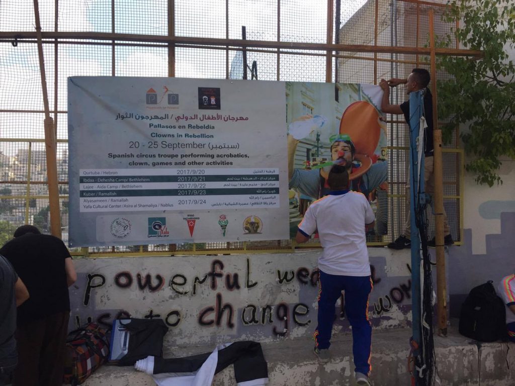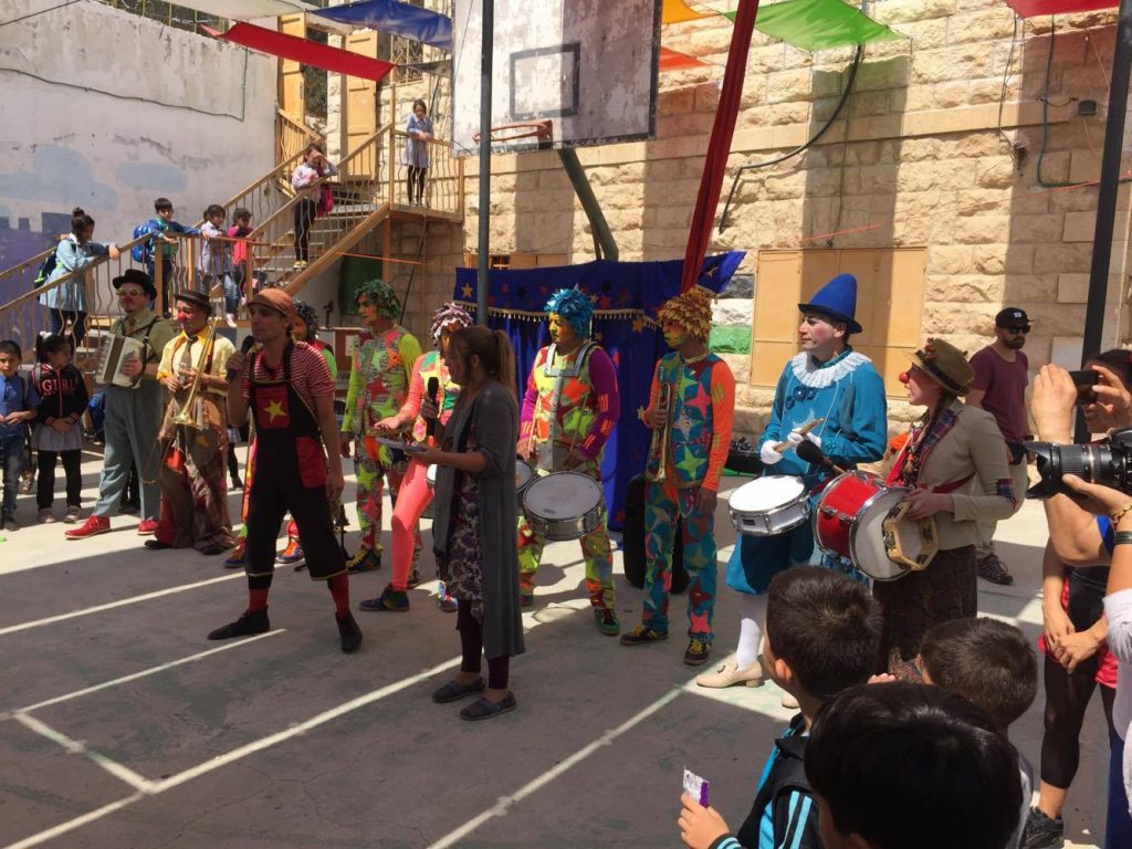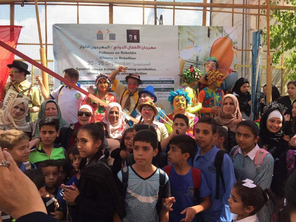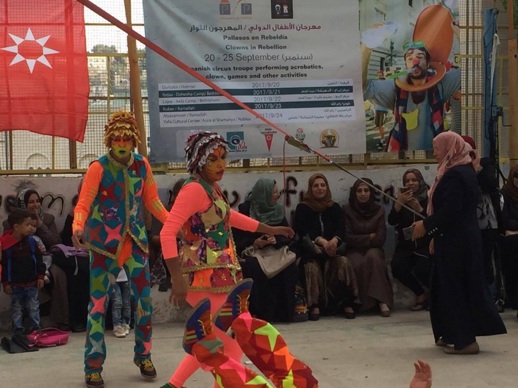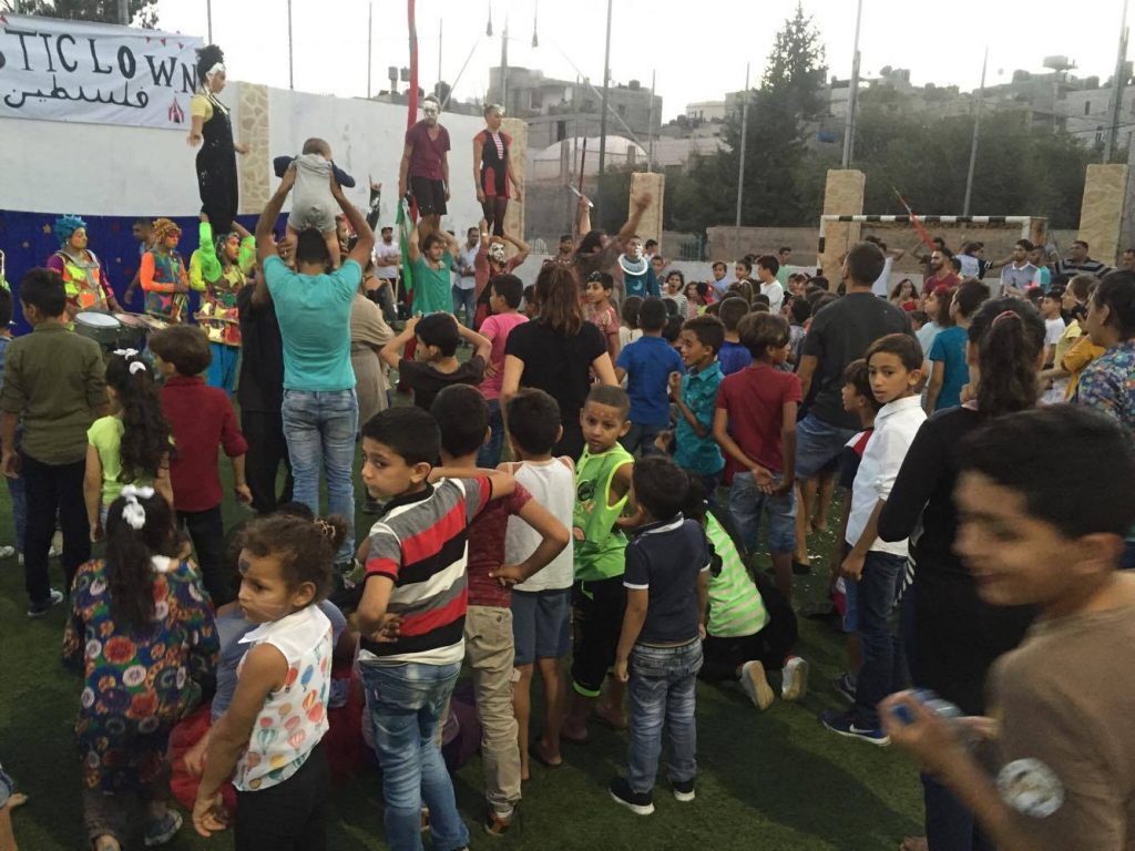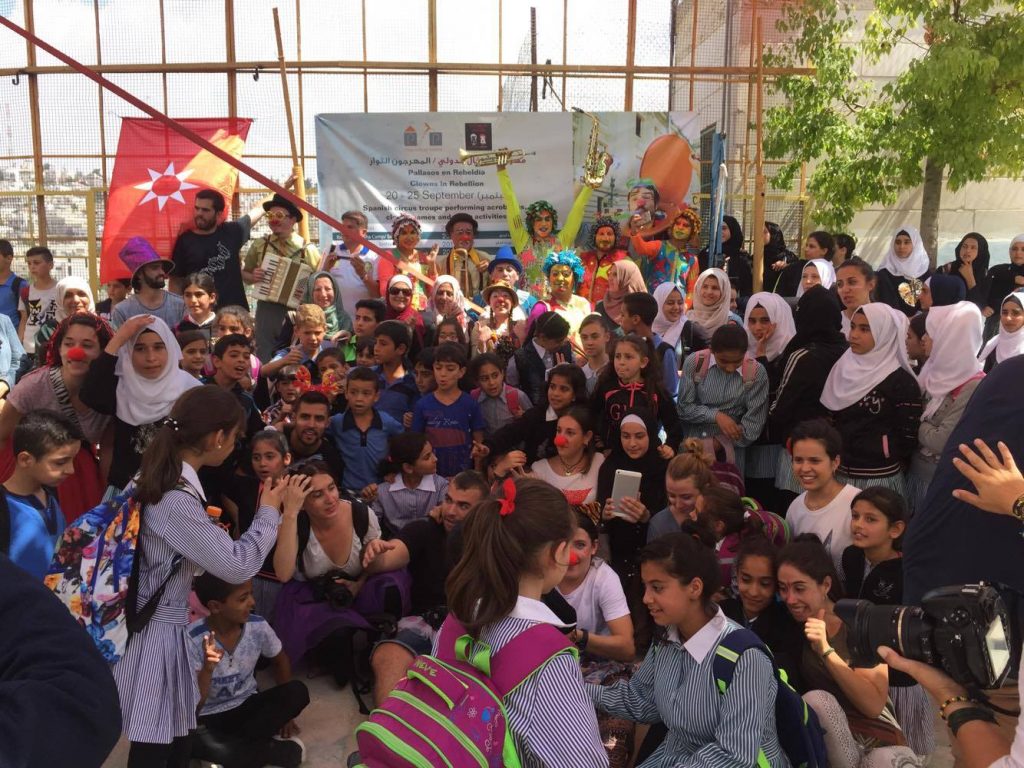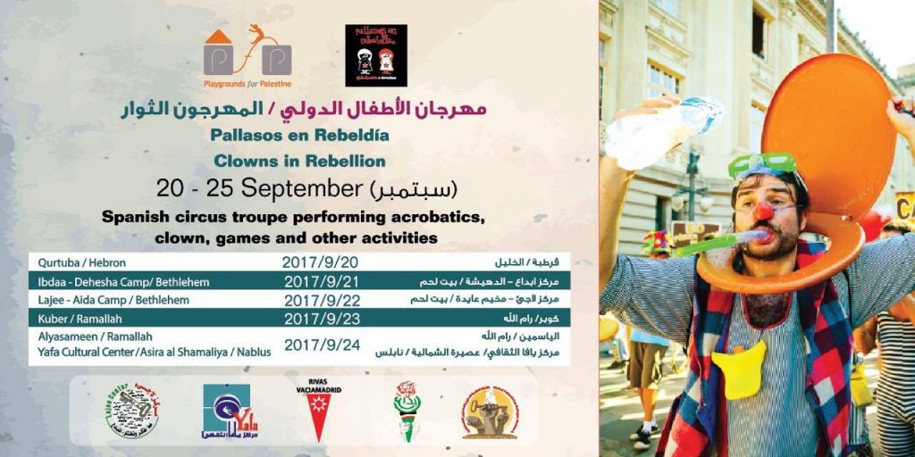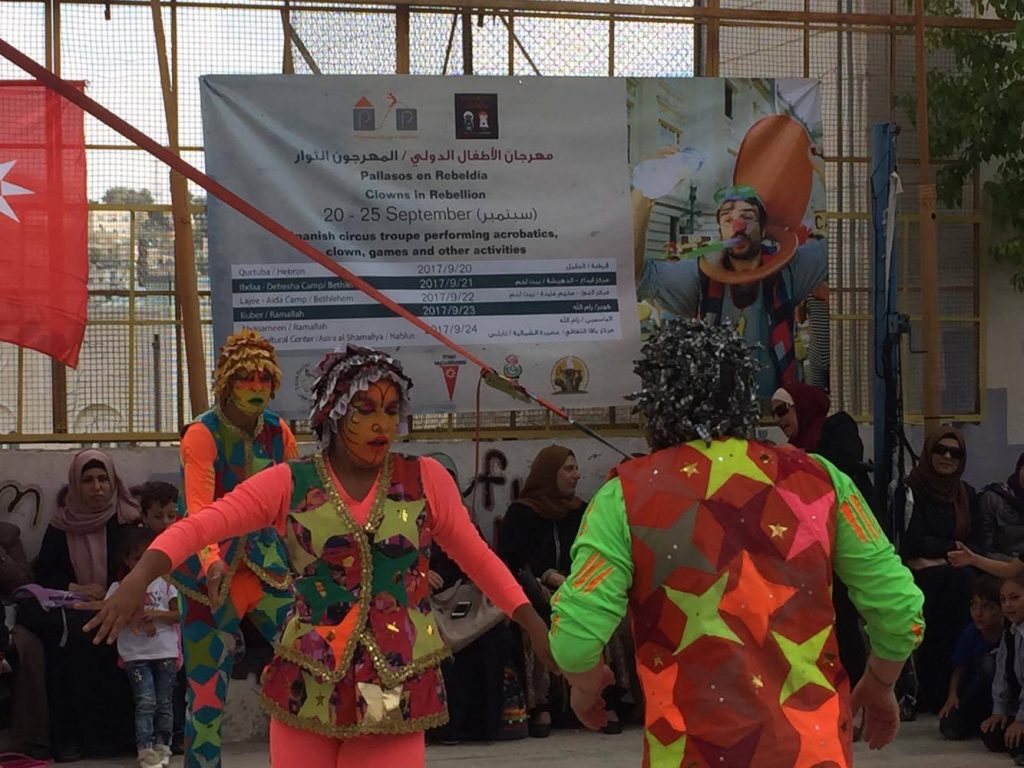 Playgrounds for Palestine teamed up with Pallasos en Rebeldía (Clowns in Rebellion), who volunteered through Lajee Center, to send them across the West Bank portion of Palestine to host day long events and acrobatics workshops for local children at our playgrounds.