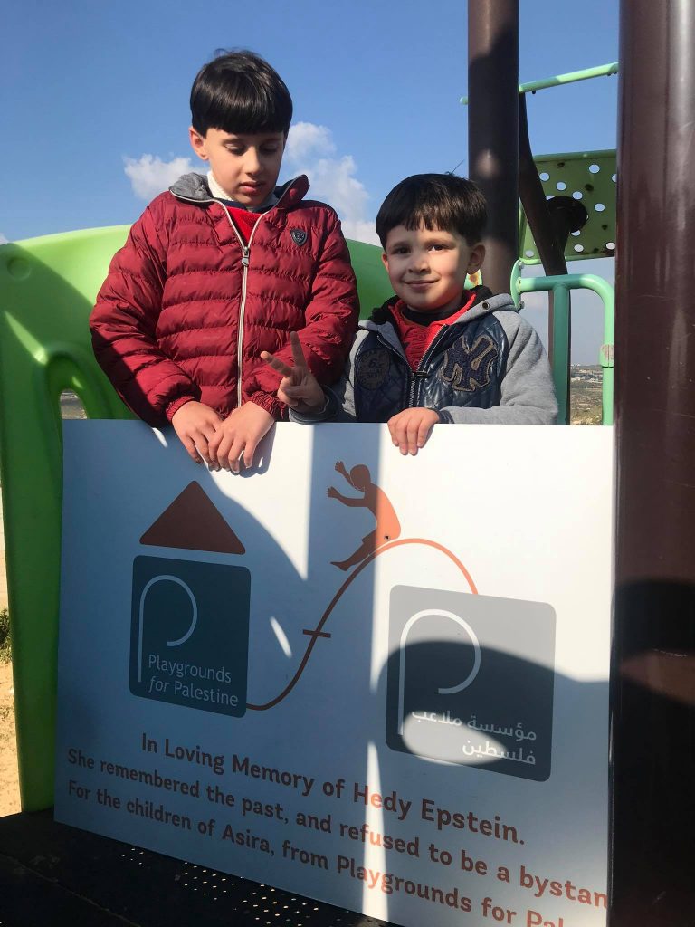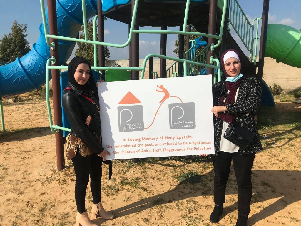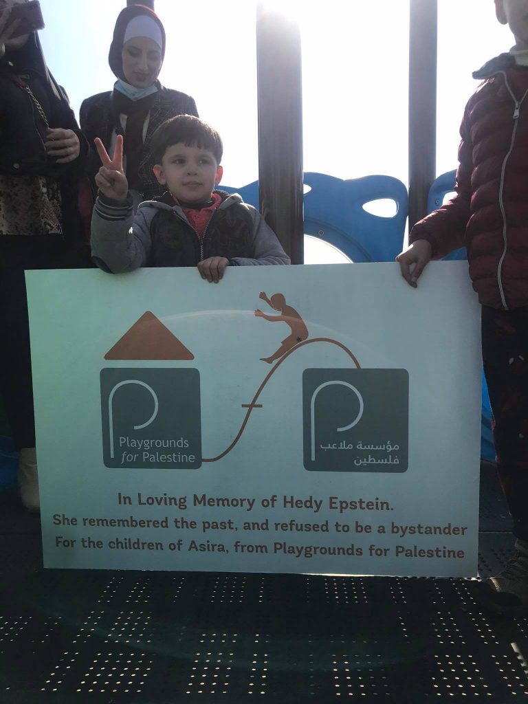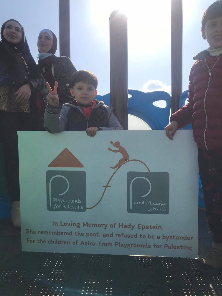 This playground was built in memory of Hedy Epstein, with funds collected by her friends in the United States. A survivor of Europe’s holocaust, Hedy spent her life fighting for justice, especially in Palestine.