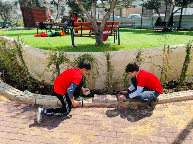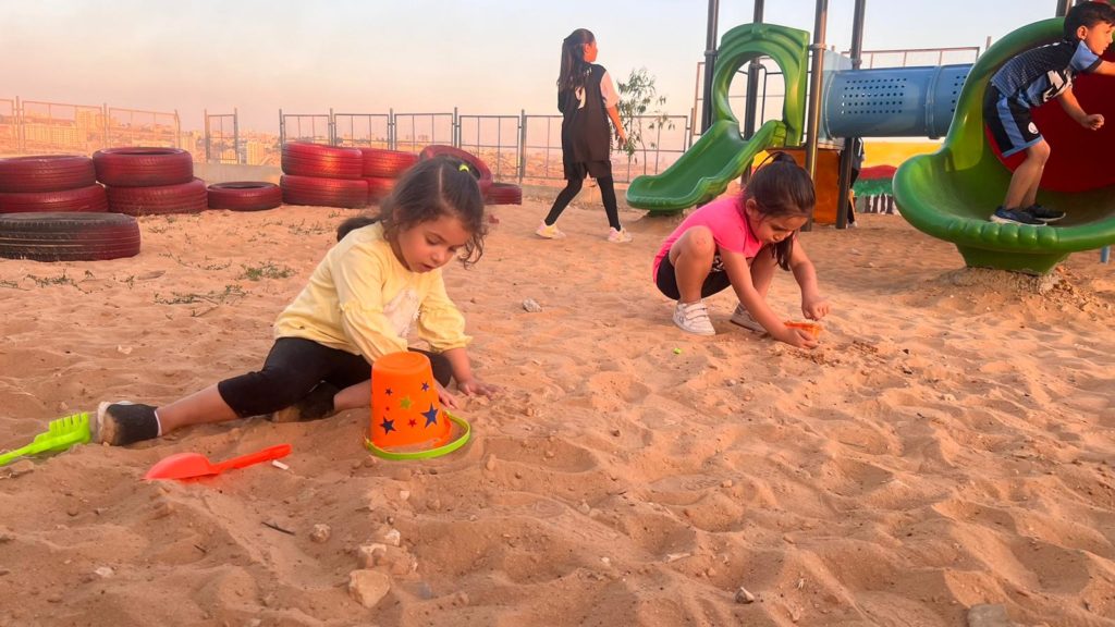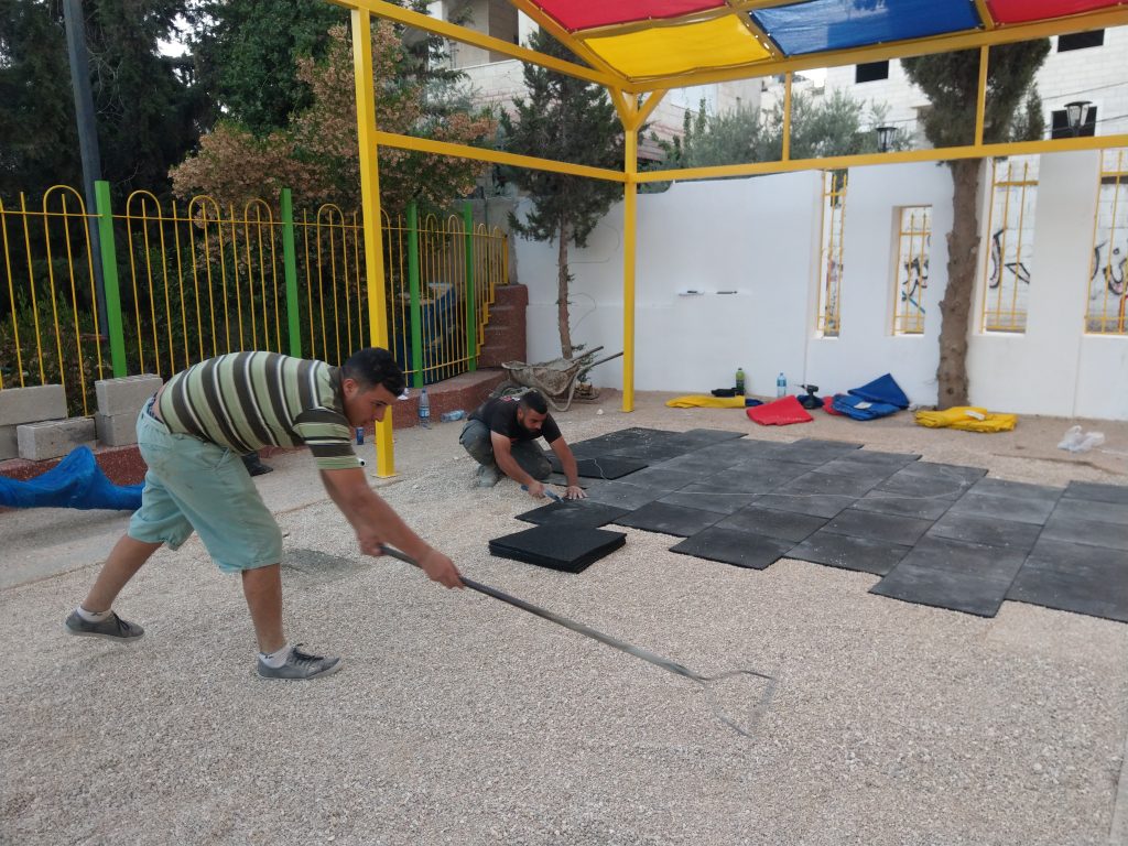 Playgrounds for Palestine is happy to support the renovation of the old playground of the school with newly designed tactile elements that are helpful for the blind children in indicating locations and mobility. The renovation of the playground has been helpful towards encouraging active lifestyles by giving children the opportunity to engage in physical activity, movement, exercise, developing their creativity, and allowing them to experience new challenges and manage difficult situations in a safe place. This supports their exploration of  new approaches to playing and problem solving, giving children the opportunity to investigate, explore, and discover the natural world. Playgrounds for Palestine also funded the building of a comfortable corner for parents to spend quality time with their children outside.