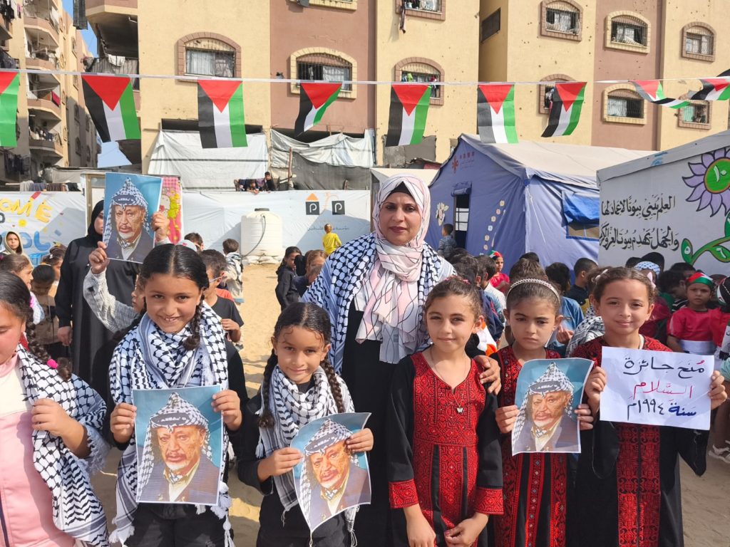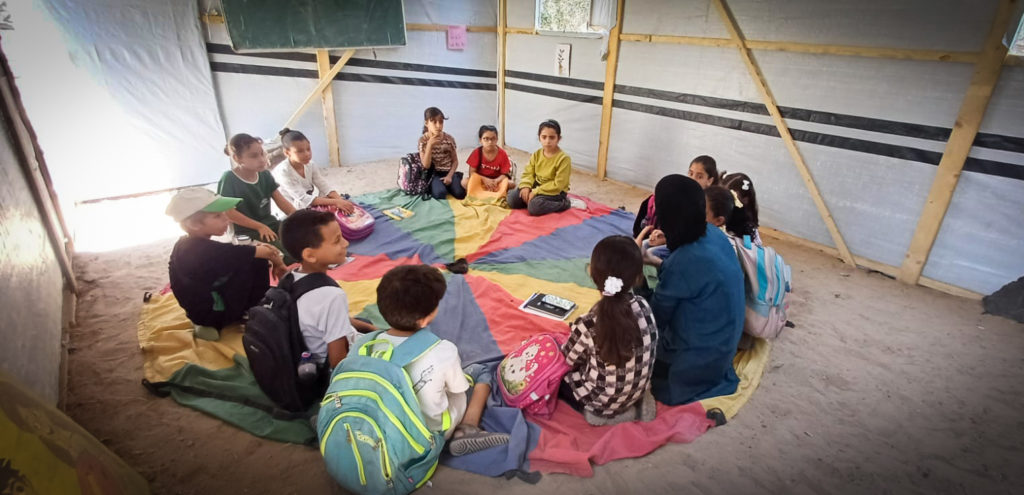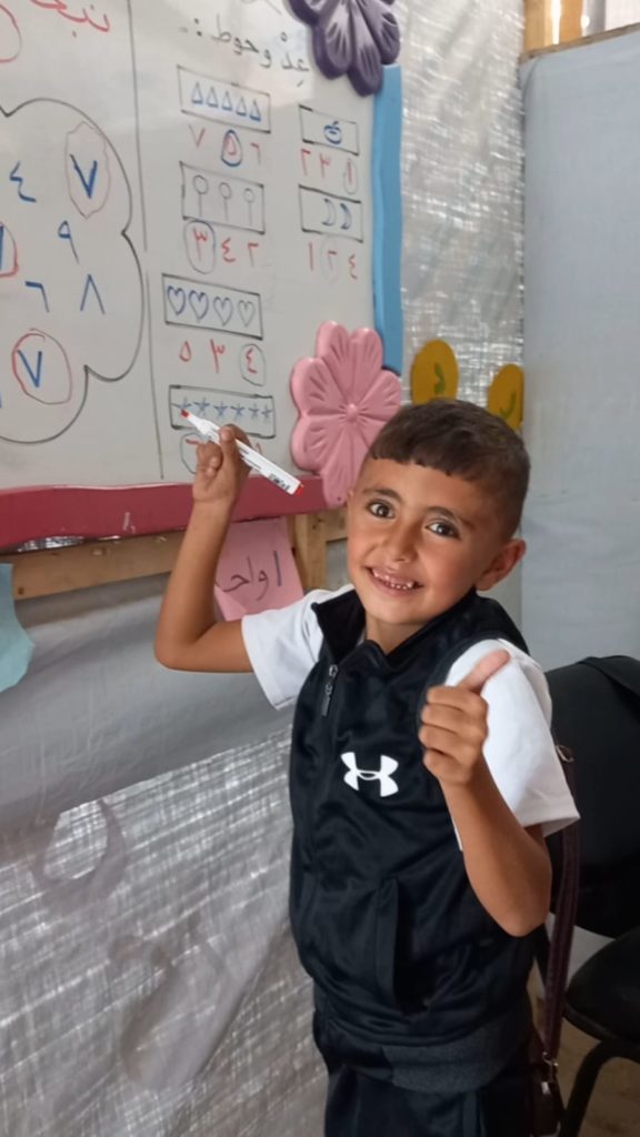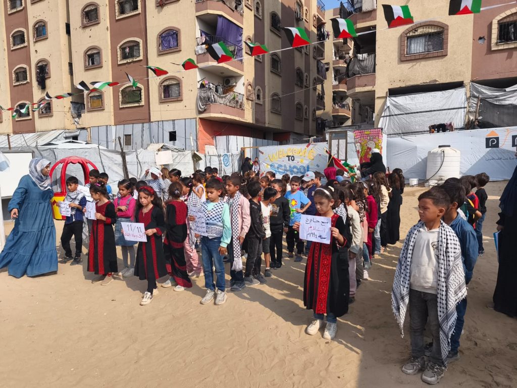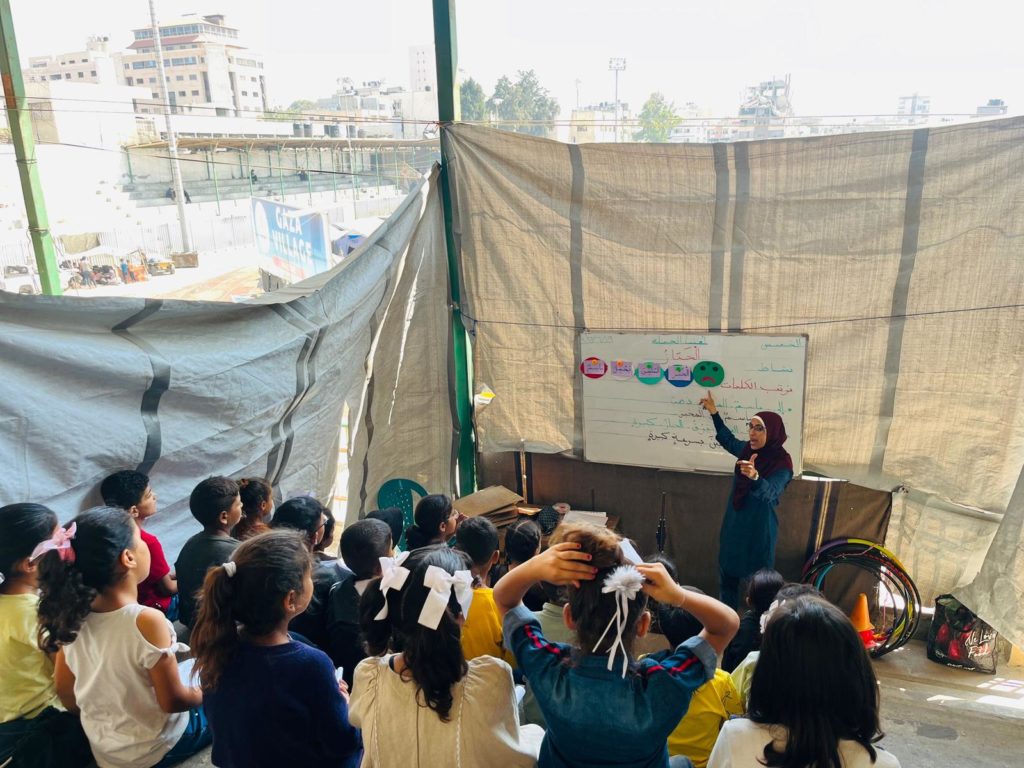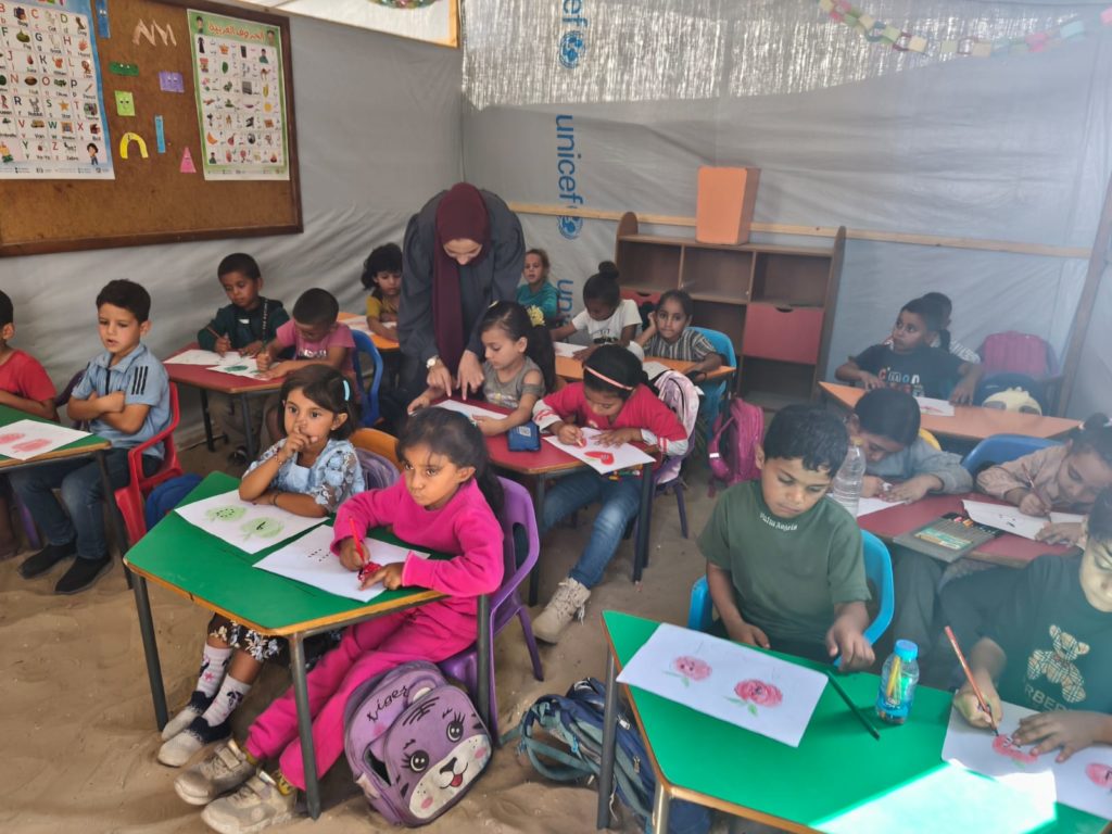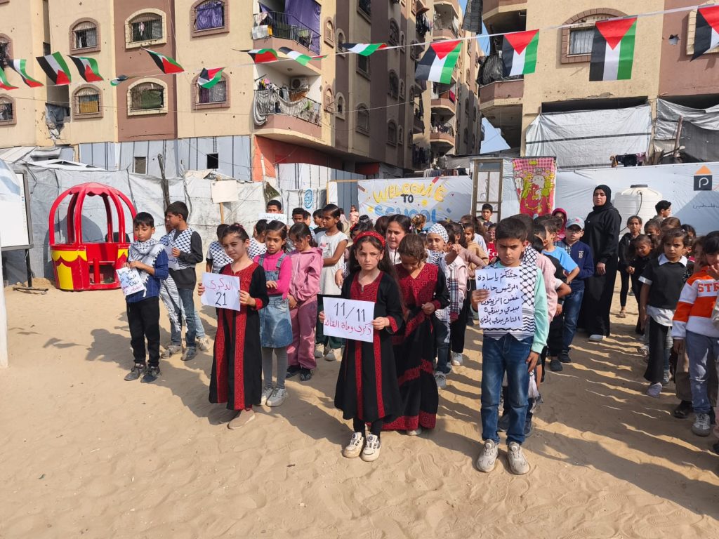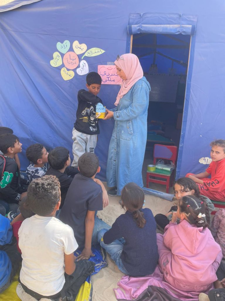 The Modern Childhood School is PfP’s second school in Gaza, serving approximately 400 students from pre-K to 5th grade. This was a fully operational school prior to the genocide, but was destroyed by Israeli bombing. The principal, Gehan, along with existing teachers at the school and with funding from PfP, re-established the school in Deir el Balah.