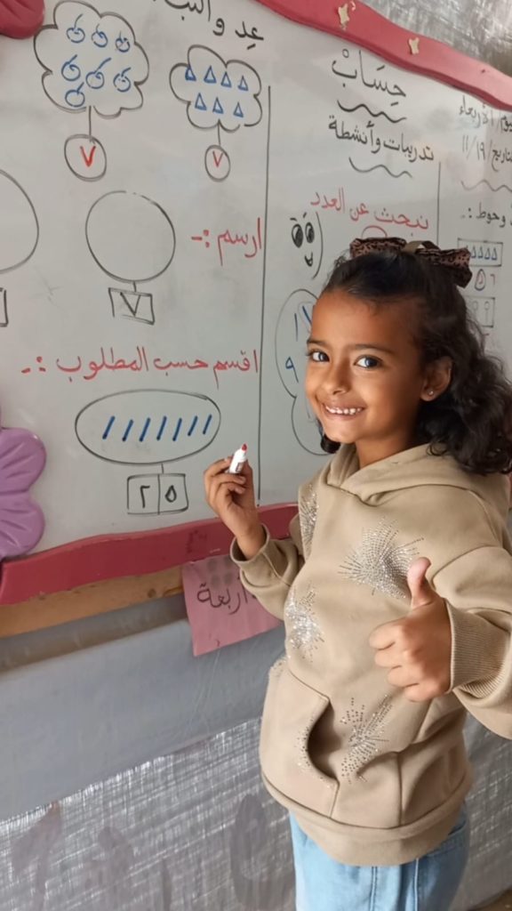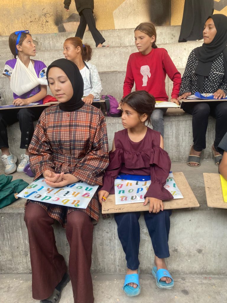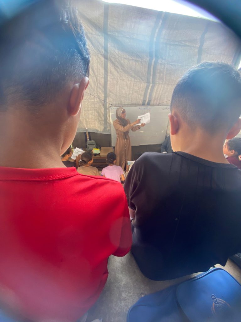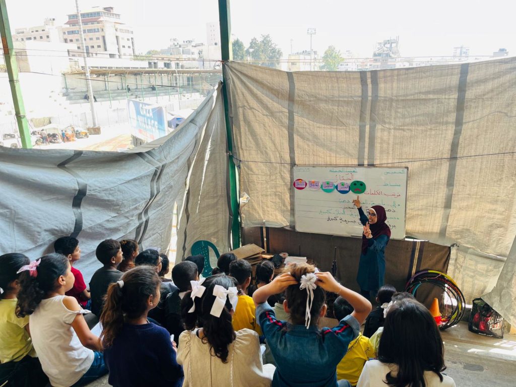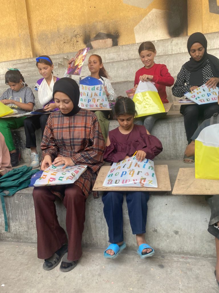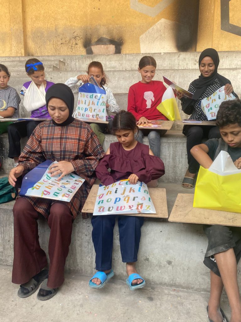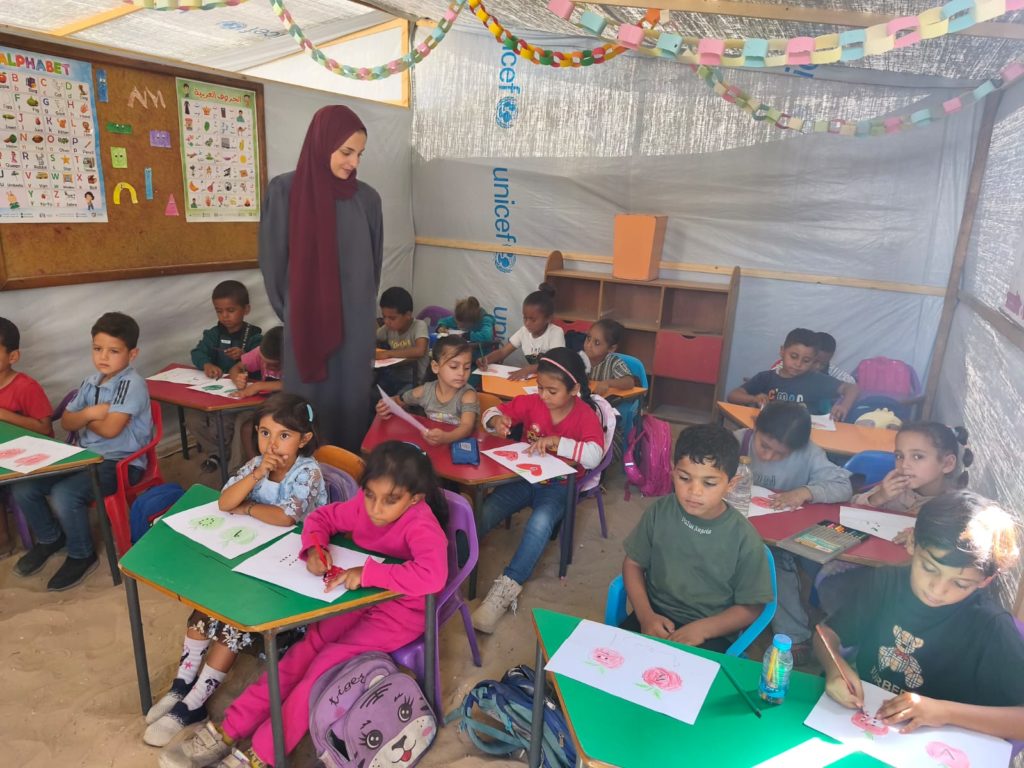 The Modern Childhood School is PfP’s second school in Gaza, serving approximately 400 students from pre-K to 5th grade. This was a fully operational school prior to the genocide, but was destroyed by Israeli bombing. The principal, Gehan, along with existing teachers at the school and with funding from PfP, re-established the school in Deir el Balah.